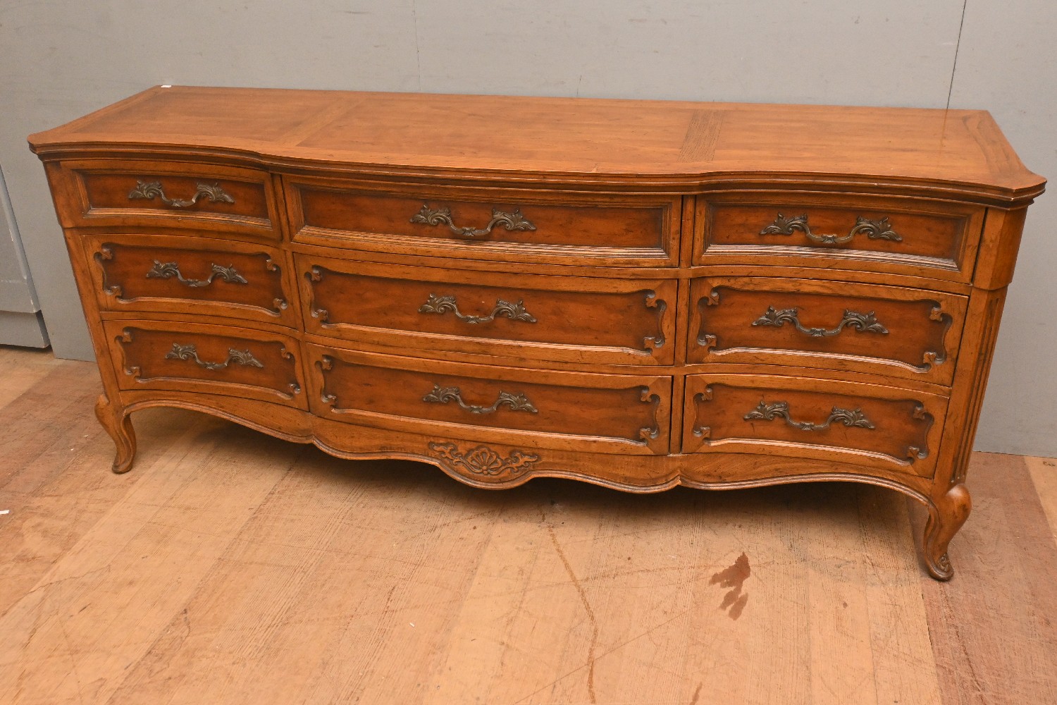 A PROVINCIAL LOUIS XV-STYLE COMMODE OF NINE DRAWERS (A/F) (80H X 187W X 52D CM) (PLEASE NOTE THIS HEAVY ITEM MUST BE REMOVED BY CARRIERS AT THE CUSTOMER'S EXPENSE. LEONARD JOEL STAFF CANNOT ASSIST CARRYING THIS ITEM) (LARGE ITEM)