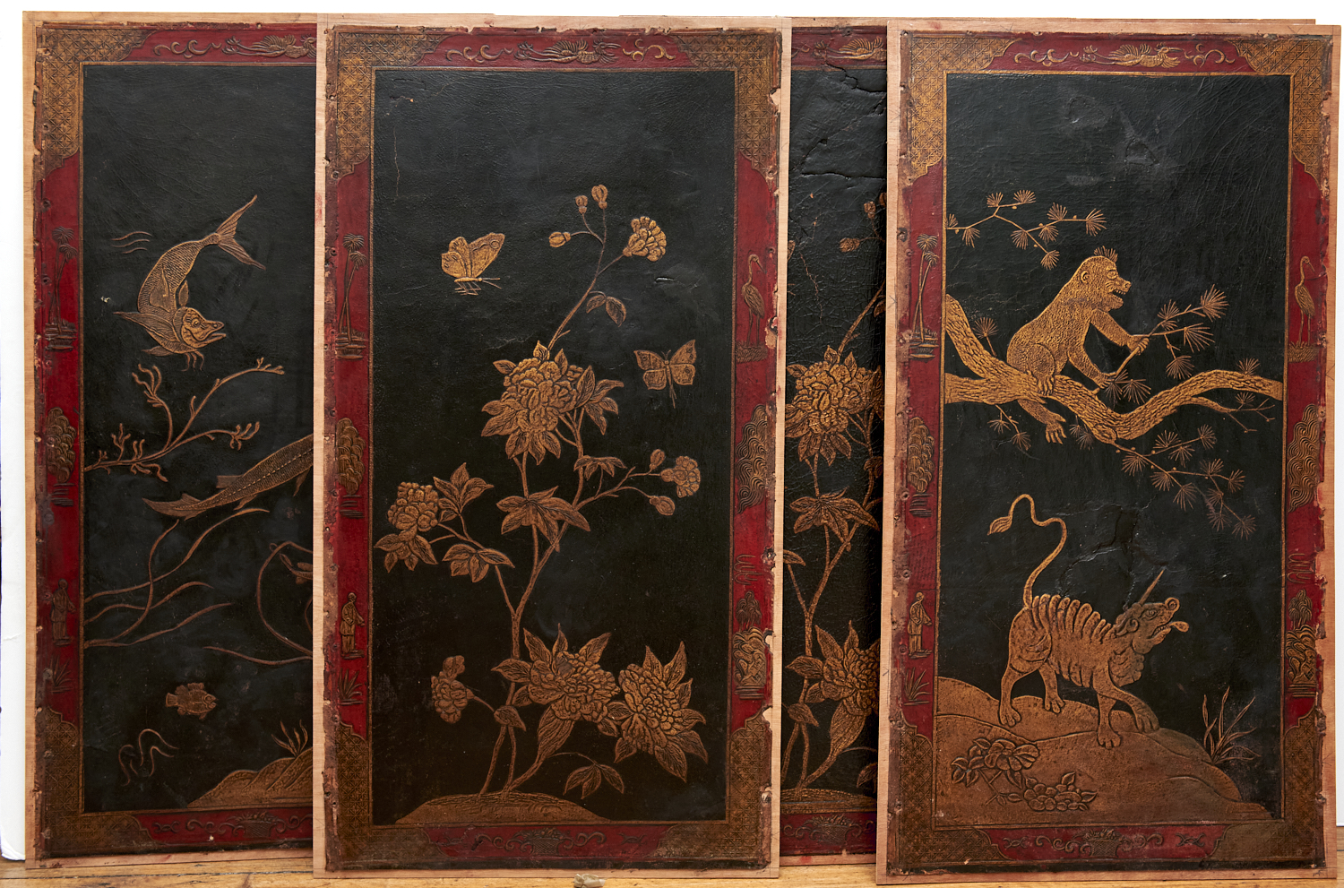 A SET OF EIGHT ANTIQUE CHINOISERIE EMBOSSED LEATHER PANELS, PROBABLY REMOVED FROM A SCREEN, NOW LAID ON PLYWOOD (A/F – SOME CRACKS AND LOSSES) EACH 89 x 48cm OVERALL, LEONARD JOEL DELIVERY SIZE: LARGE
