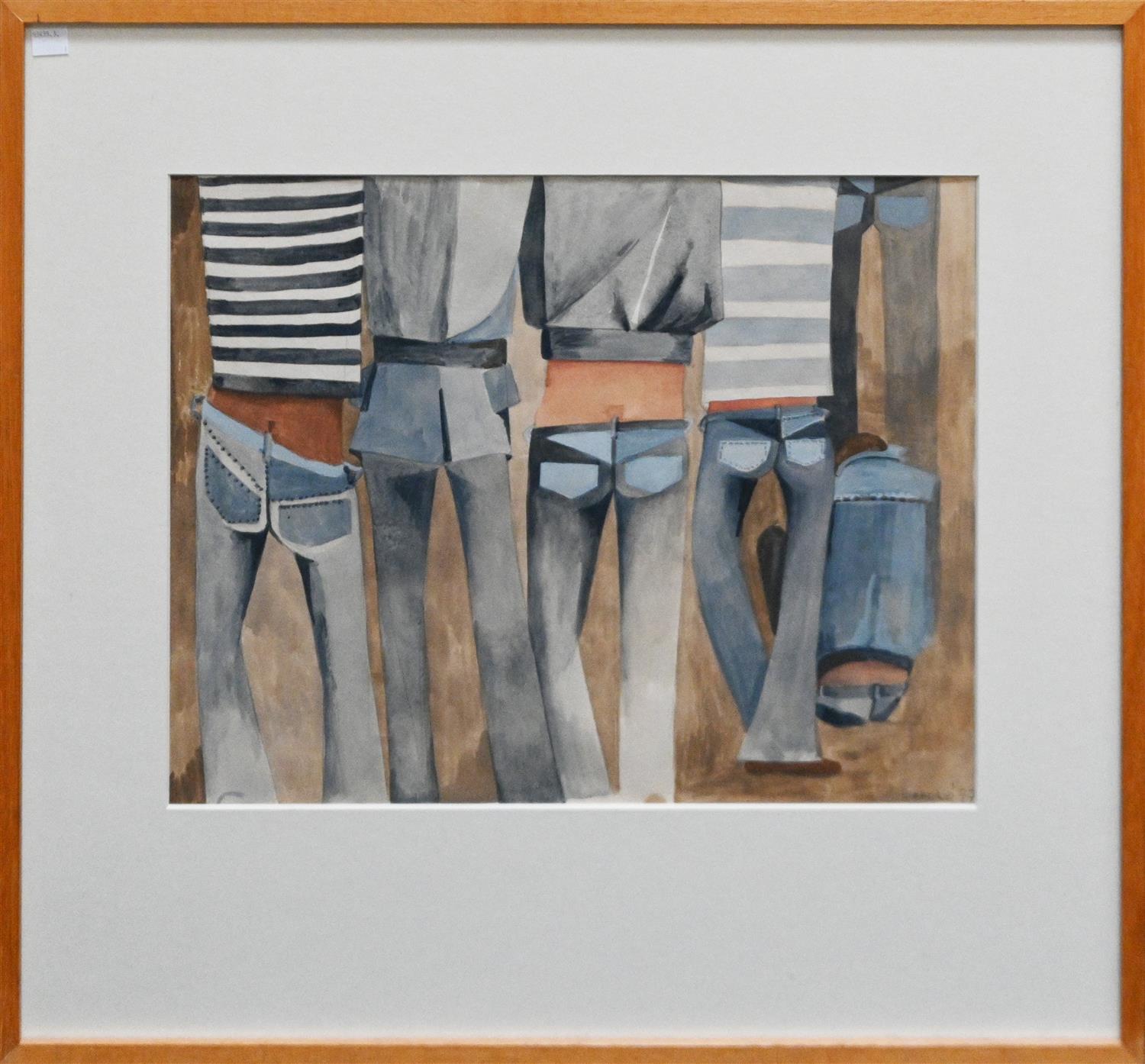 DOROTHY BRAUND, JEANS 1977, WATERCOLOUR AND GOUACHE ON PAPER, SIGNED AND DATED LOWER RIGHT, 38.5 x 51CM, FRAME SIZE: 66 X 73.5CM