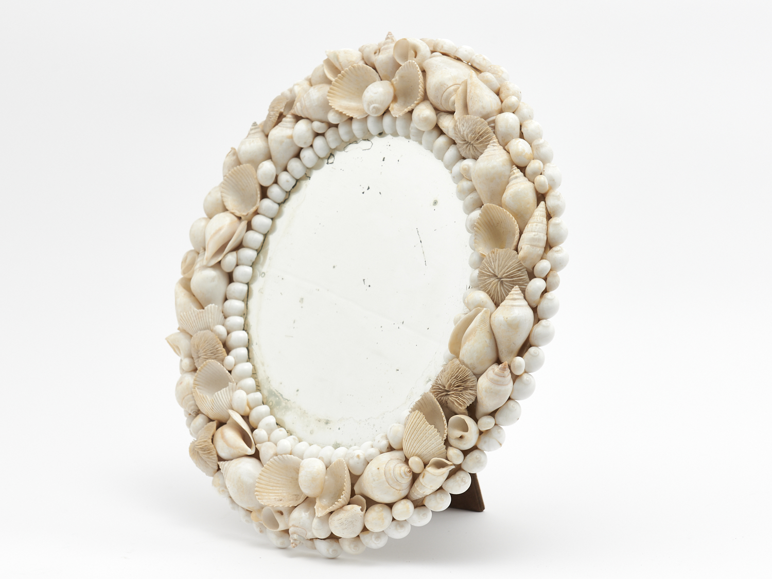 A CIRCULAR TABLE MIRROR IN A SHELL ENCRUSTED FRAME H.39CM, LEONARD JOEL DELIVERY SIZE: MEDIUM