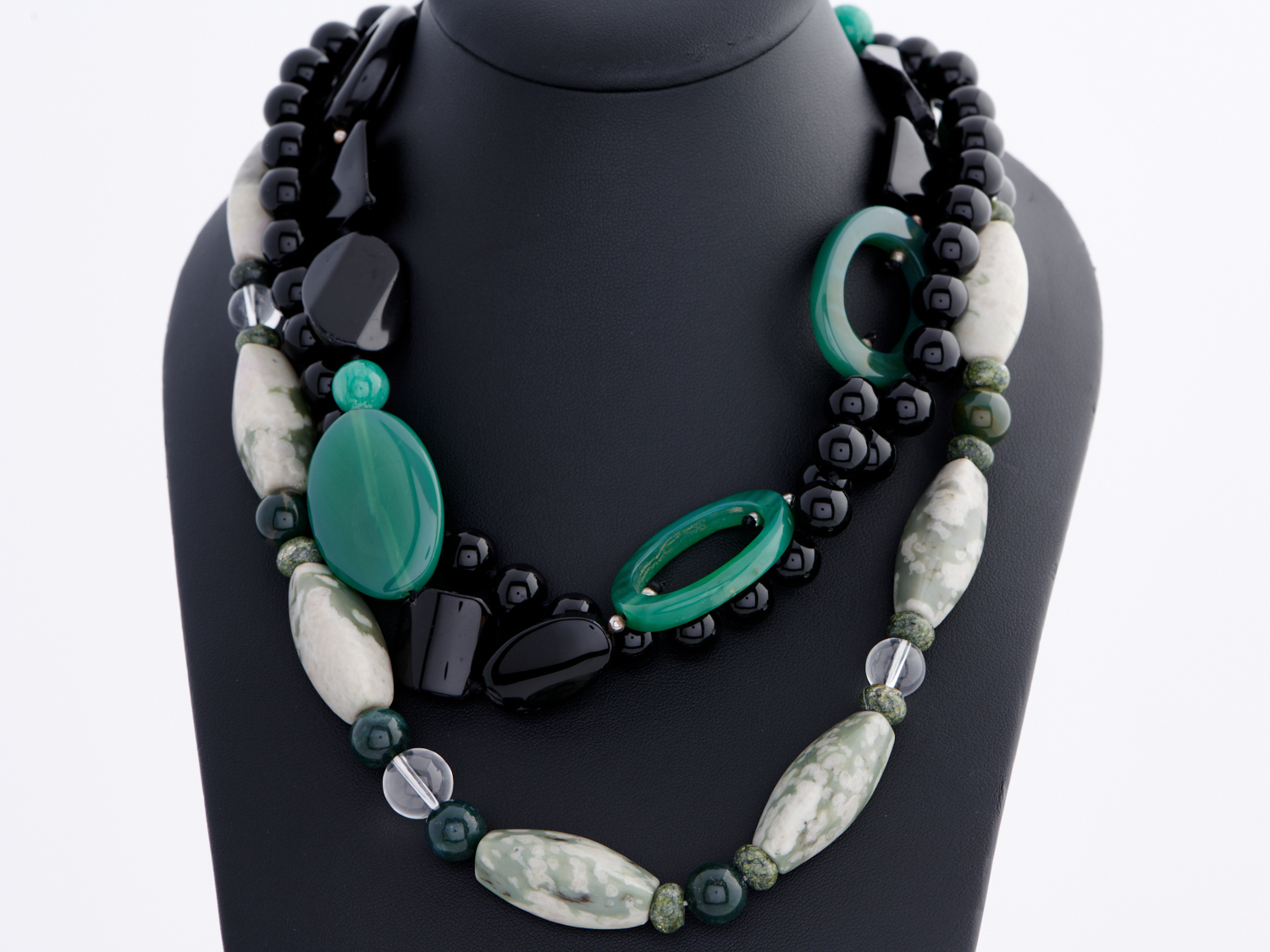 A BLACK AND GREEN BEADED AGATE NECKLACE, TOGETHER WITH A GREEN STONE AND ROCK CRYSTAL NECKLACE, LENGTHS 725MM AND 900MM