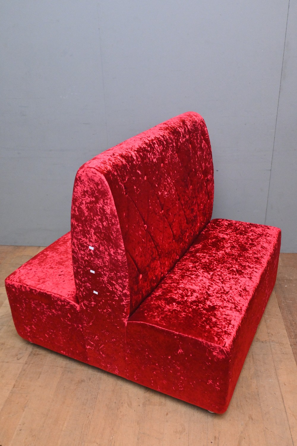 A PINK UPHOLSTERED DOUBLE SIDED BOOTH BENCH (110H X 110W X 117D CM) (PLEASE NOTE THIS HEAVY ITEM MUST BE REMOVED BY CARRIERS AT THE CUSTOMER'S EXPENSE. LEONARD JOEL STAFF CANNOT ASSIST CARRYING THIS ITEM) (X-LARGE ITEM)