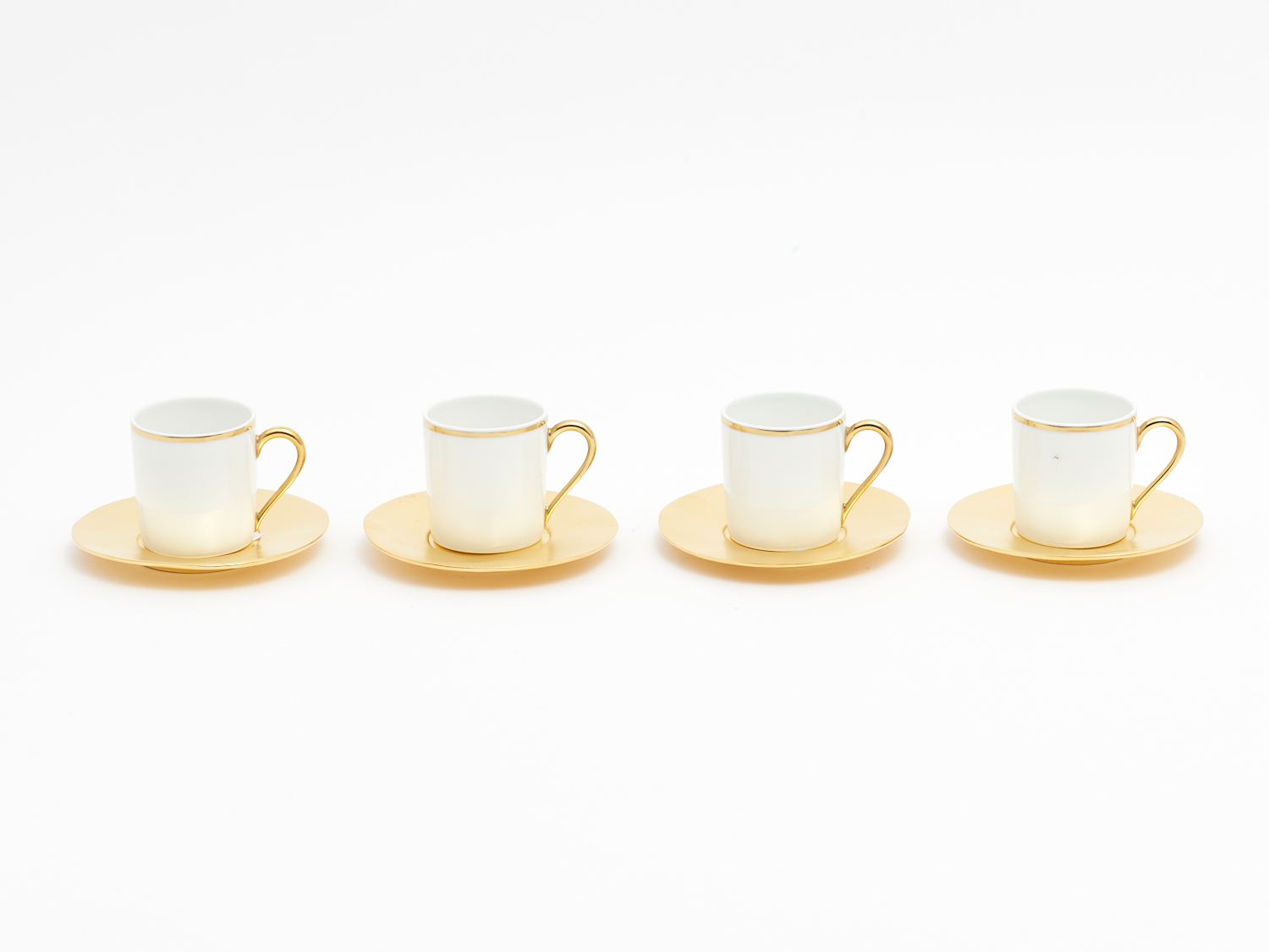 A GILDED PORCELAIN DEMI TASSE SET FOR FOUR BY EDOUARD RAMBAUD DIA.10.5CM (SAUCER), LEONARD JOEL DELIVERY SIZE: SMALL