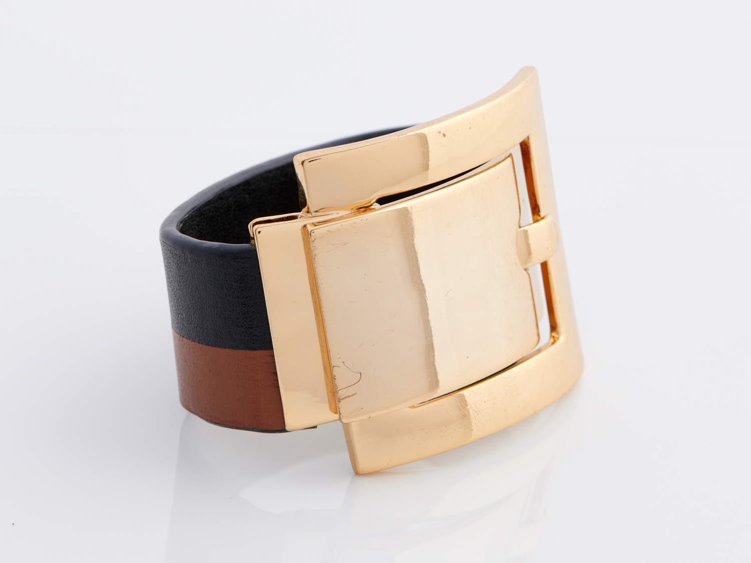 GIVENCHY, A TWO TONE LEATHER CUFF FEATURING A BELT BUCKLE CLASP IN GOLD TONE METAL