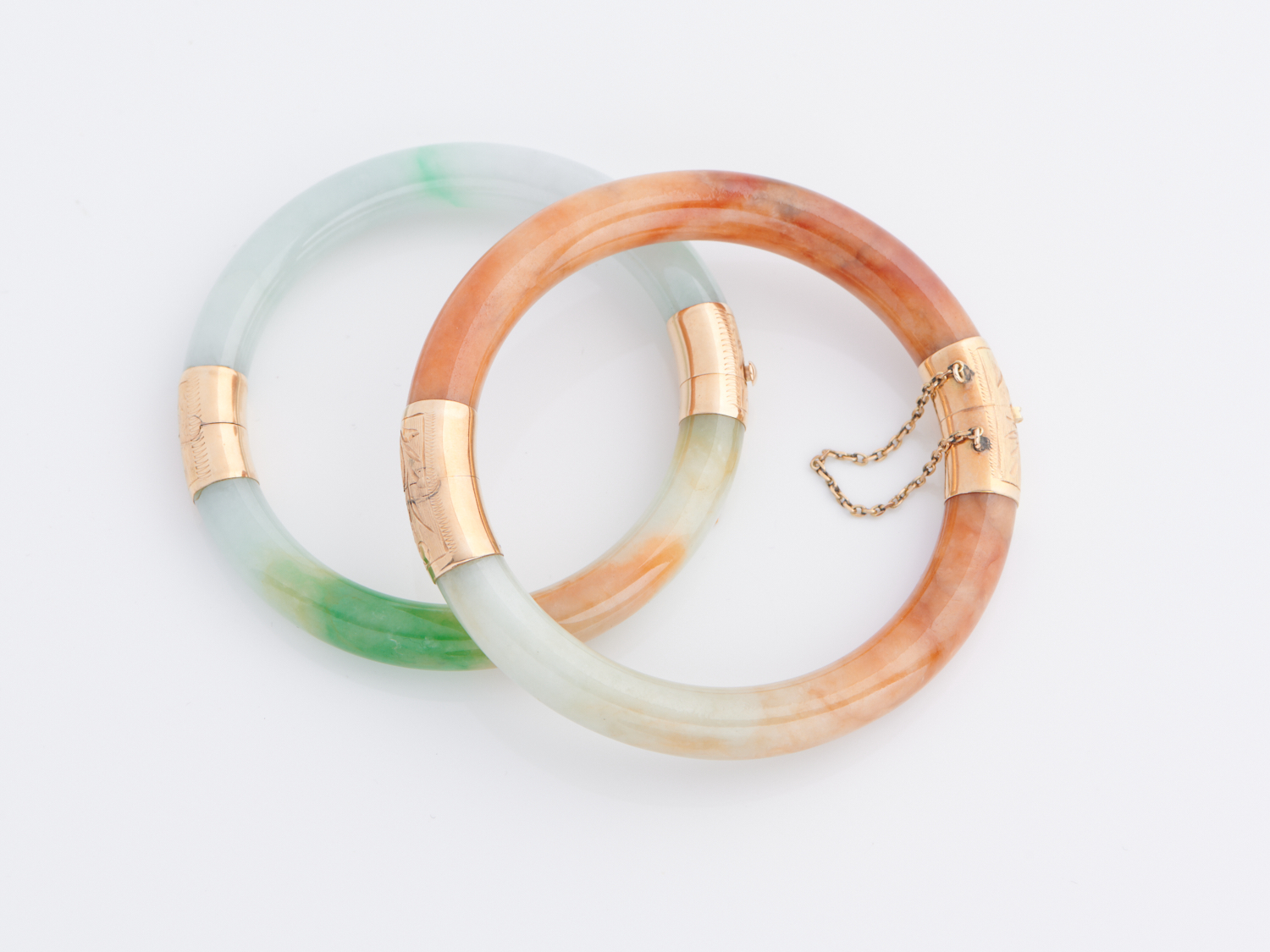 TWO JADE BANGLE MOUNTED IN 14CT GOLD, INNER DIAMETER APPOXIMATELY 50MM AND 55MM