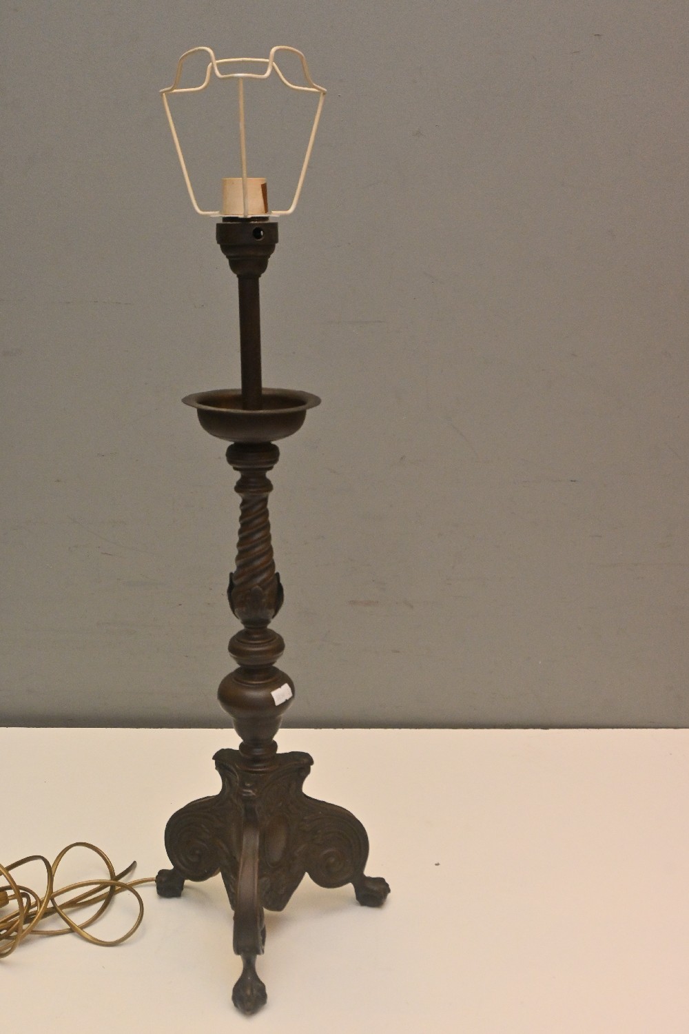 A BRASS TABLE LAMP IN THE FORM OF AN 18th CENTURY CANDLESTICK - NEEDS REWIRING (A/F) (77H CM) (LEONARD JOEL DELIVERY SIZE: MEDIUM)