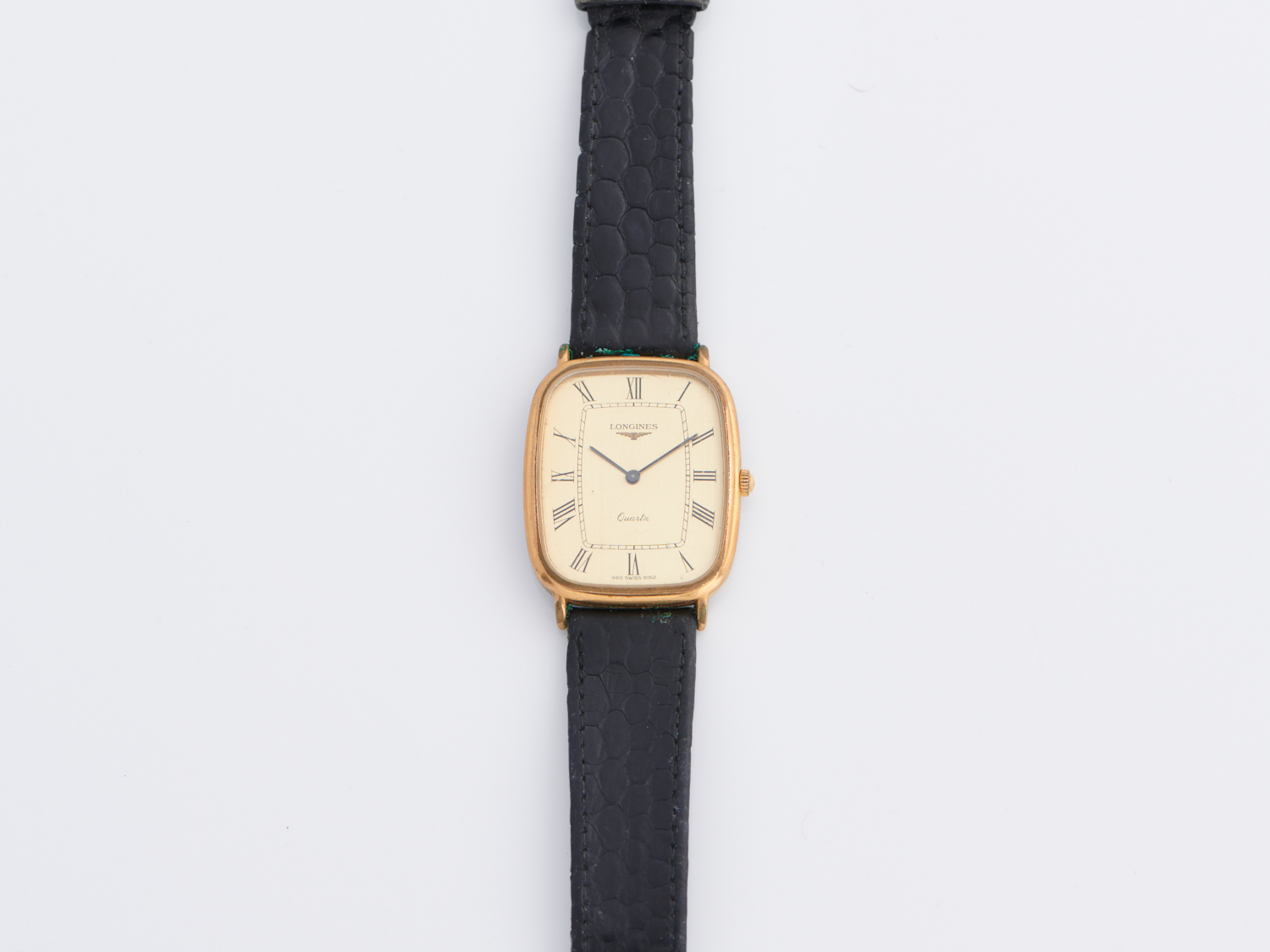 LONGINES, A WRISTWATCH CASED IN GOLD TONE STAINLESS STEEL TO BLACK LEATHER BANDS, QUARTZ MOVEMENT, THE RECTANGULAR DIAL MEASURING APPOXIMATELY 30 X 25MM