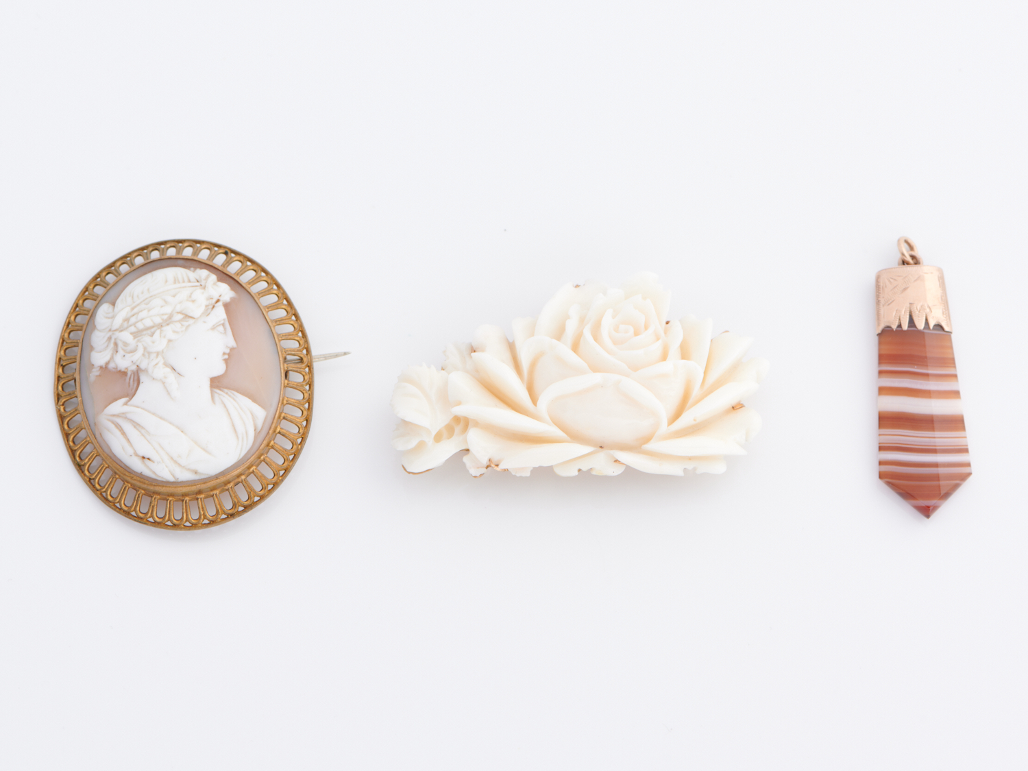 TWO BROOCHES TOGETHER WITH AN AGATE PENDANT, INCLUDING TWO WITH FITTINGS IN 9CT GOLD