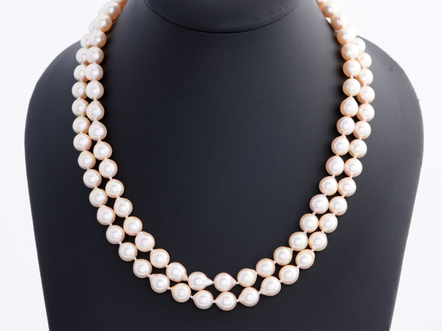 A LONG STRAND OF CULTURED PEARLS TO A CLASP IN 14CT TRI COLOUR GOLD, LENGTH 910MM