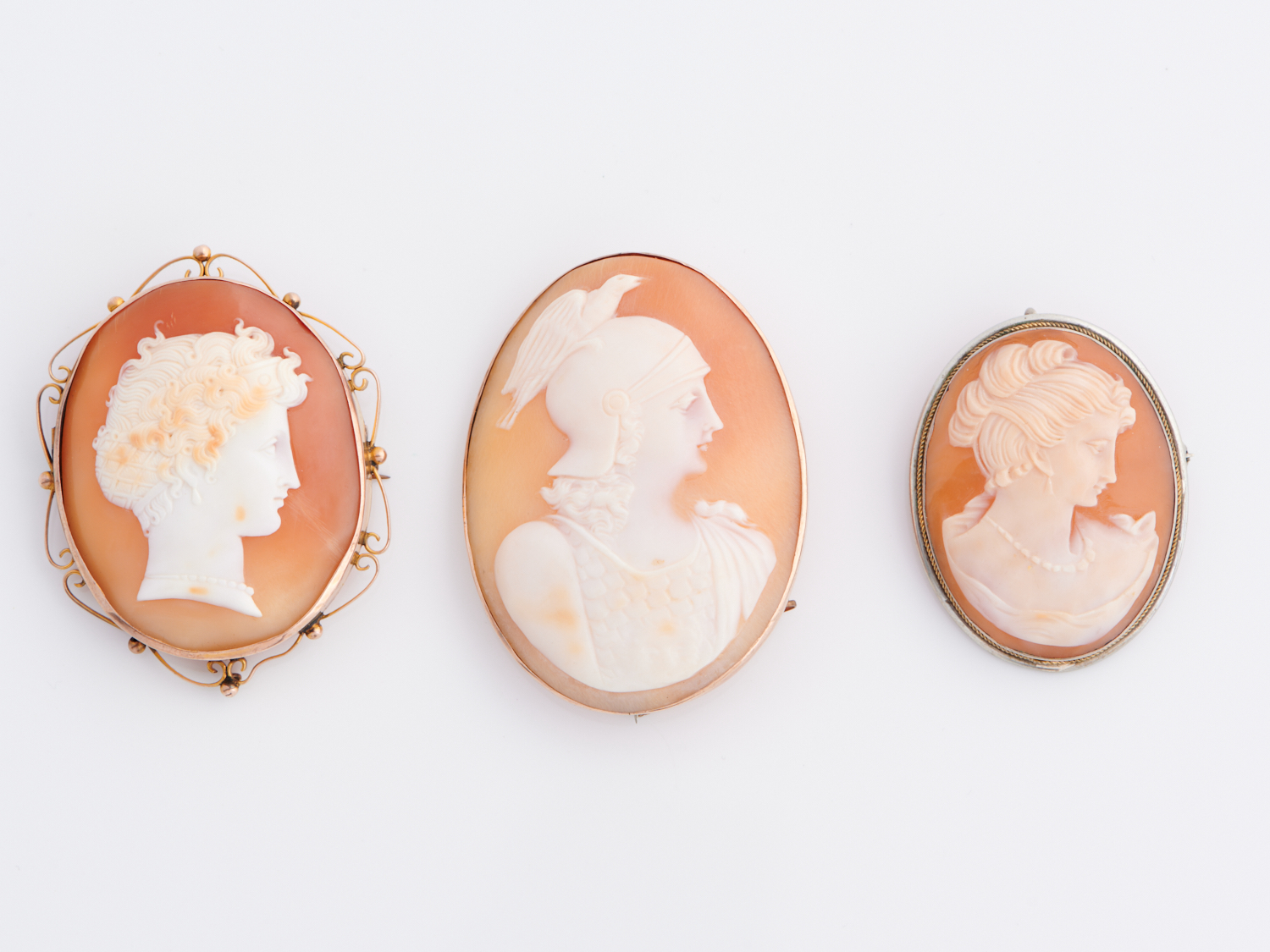 A COLLECTION OF THREE CAMEO BROOCHES, INCLUDING TWO WITH FRAMES IN 9CT GOLD