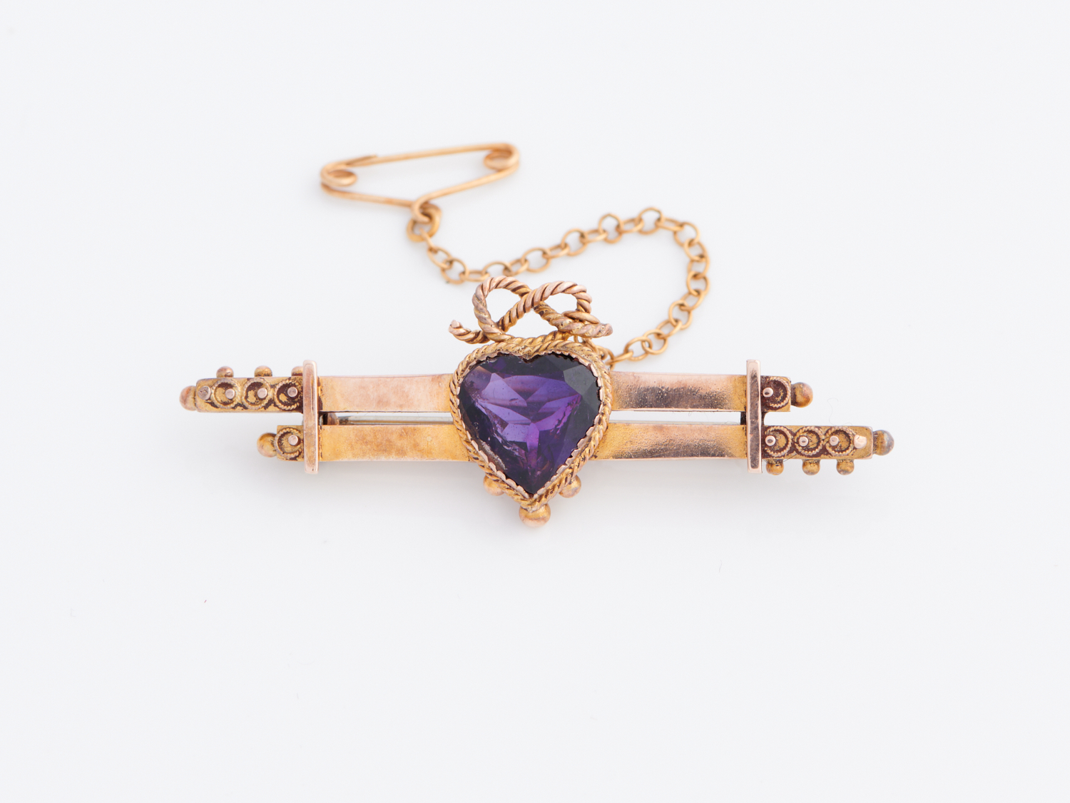 AN AMETHYST HEARTH BROOCH IN 9CT GOLD, 50MM, 3.8GMS, HALLMARKED