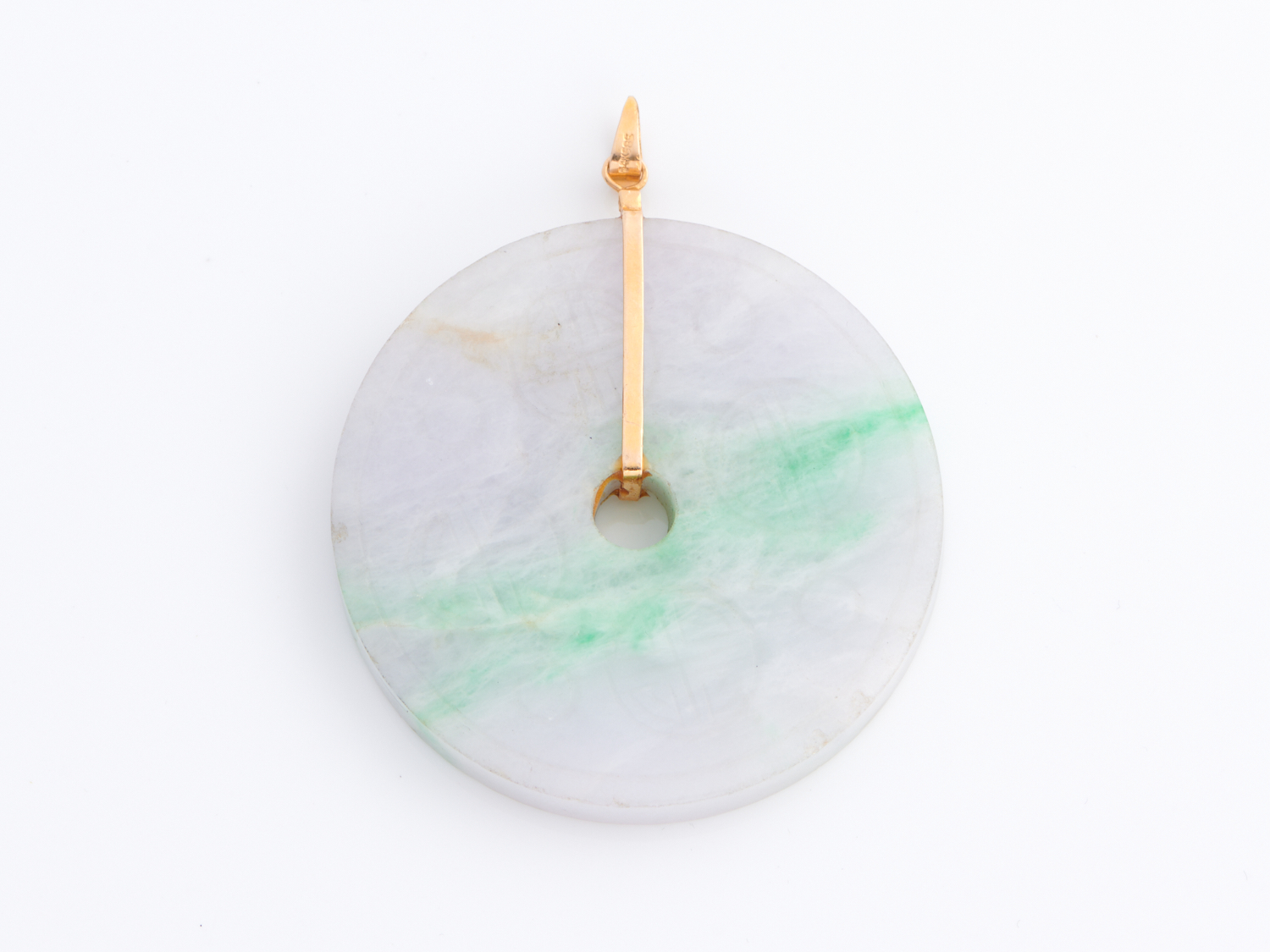 A LARGE JADE PENDANT MOUNTED IN 14CT GOLD, DIAMETER 50MM