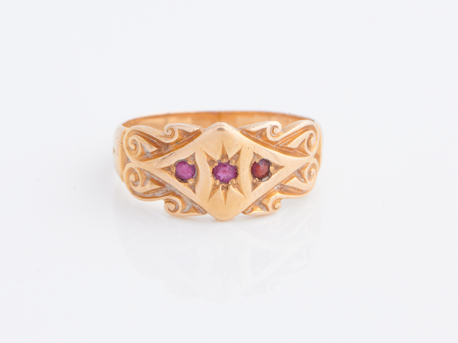 AN ANTIQUE GARNET RING IN 18CT GOLD RING, SIZE K, 4.0GMS