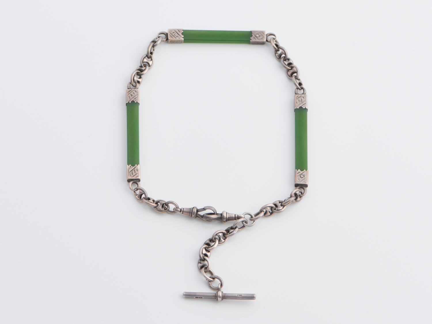 A JADE FOB CHAIN IN SILVER, 330MM