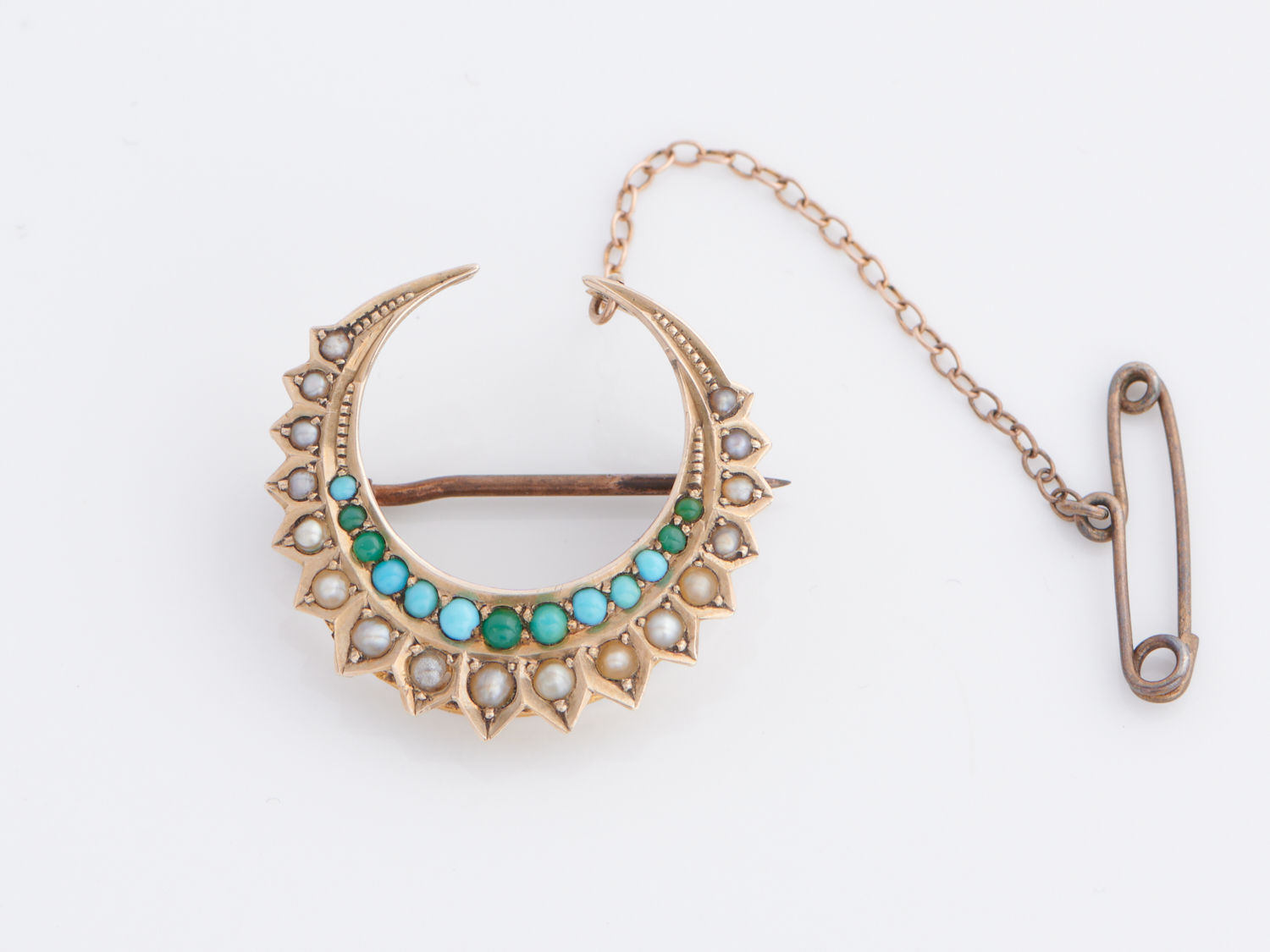A TURQUOISE AND SEED PEARL CRESCENT BROOCH IN 9CT GOLD, 25MM, 3.6GMS