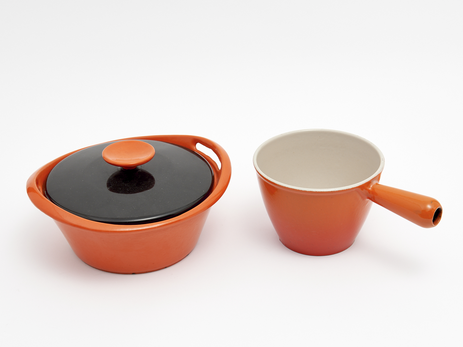 TWO ORANGE RETRO LE CREUSET ITEMS INCL. A SAUCE PAN AND LIDDED DISH L.27CM (LARGEST), LEONARD JOEL DELIVERY SIZE: SMALL