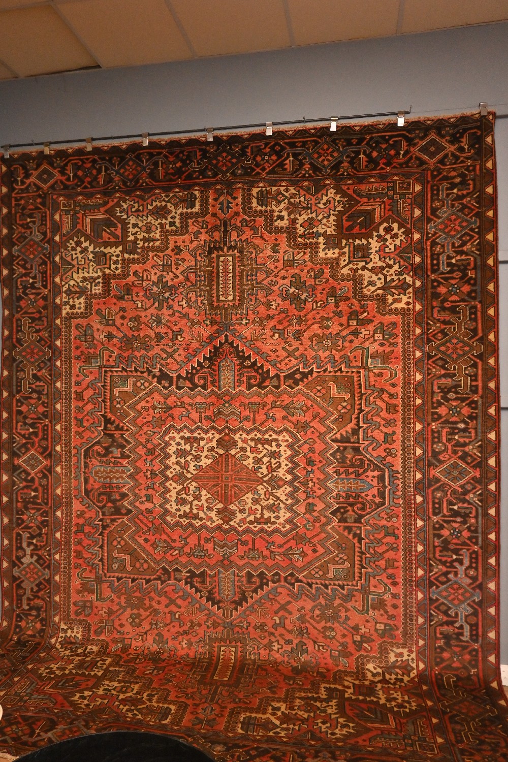 A CIRCA 1970'S PERSIAN HERIZ GEROVAN CARPET. 100% HAND SPUN WOOL, ORGANIC DYES, MINOR VINTAGE PILE. HAND-WOVEN IN THE VILLAGES OF THE HERIZ REGION, AN IMPORTANT CARPET-PRODUCING REGION OF AZERBAIJAN PROVINCE IN THE NORTHWEST. WITH TRADITIONAL DESIGN OF BOLD DOMINANT MEDALLION & QUARTERED CORNER MEDALLIONS IN MADDER, CREAM, FRENCH BLUE AND BRUNSWICK GREEN, ON A TERRACOTTA TUSCAN TONED FIELD OF PALMETTES, GEOMETRIC MOTIFS & OAK LEAVES. BORDER OF GEOMETRIC MOTIFS. ORIGIN: PERSIA - RRP: $6,900 - SIZE: 403 X 305 CM DOCUMENTATION OF AUTHENTICITY INCLUDED.