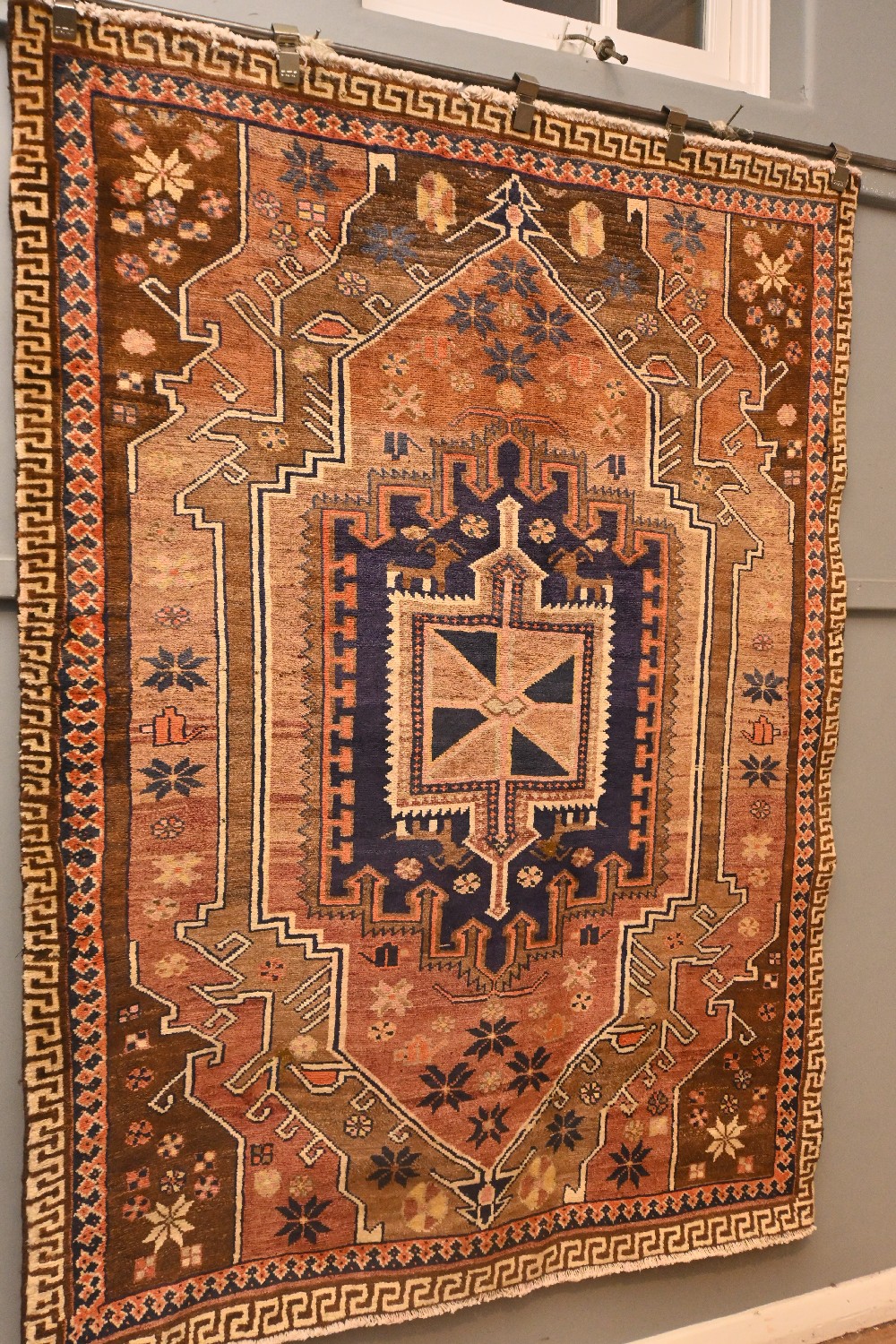 A CIRCA 1960'S PERSIAN NOMADIC LURISTAN RUG. 100% WOOL AND NATURAL DYES. SEMI VINTAGE PILE. HAND KNOTTED NOMADIC WEAVE WITH A DESIGN OF CENTRAL HEXAGONAL MEDALLION CONTAINING TRIBAL MOTIFS WITH A CANDLESTICK BORDER ON A FRENCH BLUE AND RUST TONE FIELD. ALL OVER TRIBAL GEOMETRIC AND ROSETTE MOTIFS ON A SAGE GREEN SECONDARY FIELD. POLISH TO THE WOOL. SIZE: 204 X 155 CM ORIGIN: PERSIA – RRP: $1,500 DOCUMENTATION OF AUTHENTICITY INCLUDED.