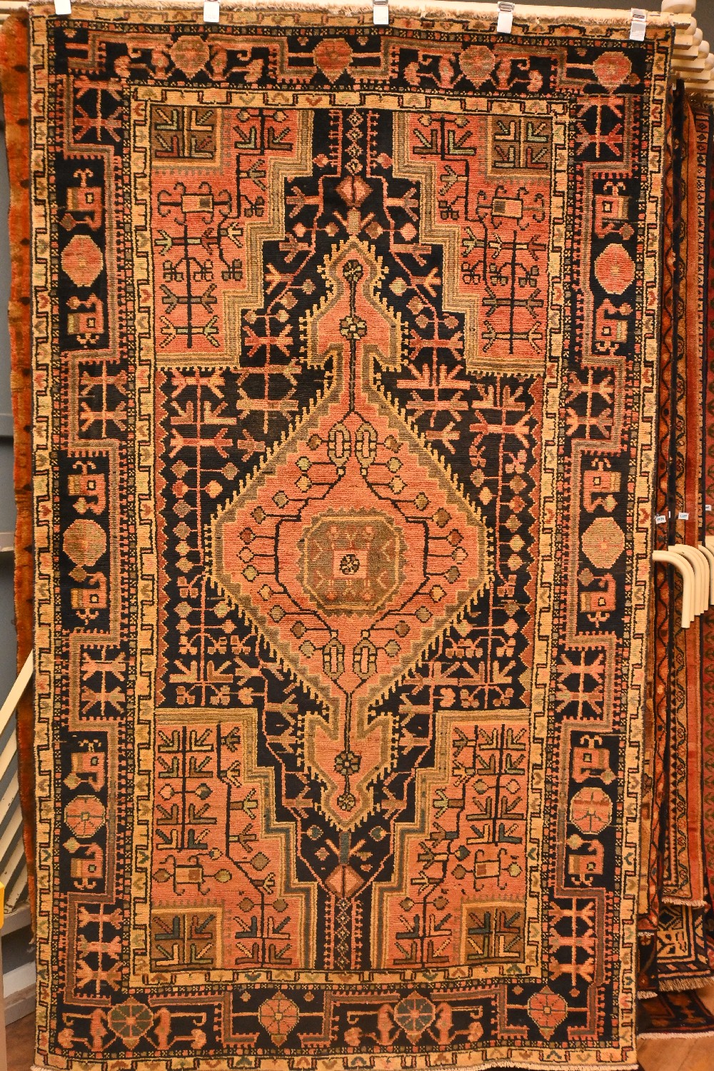A TRIBAL PERSIAN TOYSERKAN RUG, CIRCA 1970'S. 100% WOOL & NATURAL DYES. HAND-KNOTTED VILLAGE WEAVE WITH TRIBAL DESIGN OF BOLD HEXAGONAL ANCHORED MEDALLION & CORNER MEDALLIONS IN A SOFT RED ON A CHARCOAL-TONED FIELD OF GEOMETRIC PATTERNS & LEAF FORMS. CORNER MEDALLIONS IN A SOFT RED FIELD OF TREE OF LIFE DESIGN AND GEOMETRIC DESIGNS. BORDER OF ROSETTES & GEOMETRIC MOTIFS. ORIGIN: IRAN- RRP: $1,600- SIZE: 244 X 143 CM DOCUMENTATION OF AUTHENTICITY INCLUDED