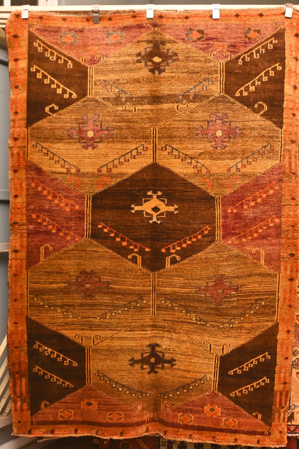 AN UNUSUAL FIRST TIME OFFERED TRIBAL PERSIAN CIRCA 1960'S ALESHTAR RUG. 100% WOOL, WARP AND WEFT PILE. HAND-SPUN WOOL, ORGANIC DYES. HAND-KNOTTED TRIBAL WEAVE OF ALL OVER HEXAGONAL PANEL DESIGN CONTAINING TRIBAL MOTIFS ON A SOFT TAN AND CHOCOLATE FIELD WITH A HINT OF SOFT MAGENTA SOME MINOR RESTORATION SIZE: 217 X 147 CM-ORIGIN: PERSIA – RRP: $2,900 DOCUMENTATION OF AUTHENTICITY INCLUDED