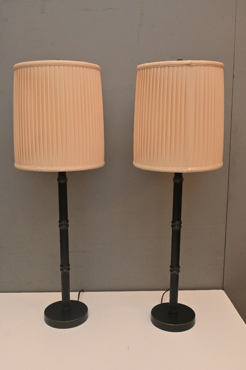 A PAIR OF METAL BAMBOO EFFECT TABLE LAMPS WITH PLEATED SHADES (84H X 28D CM) (LEONARD JOEL DELIVERY SIZE: LARGE)