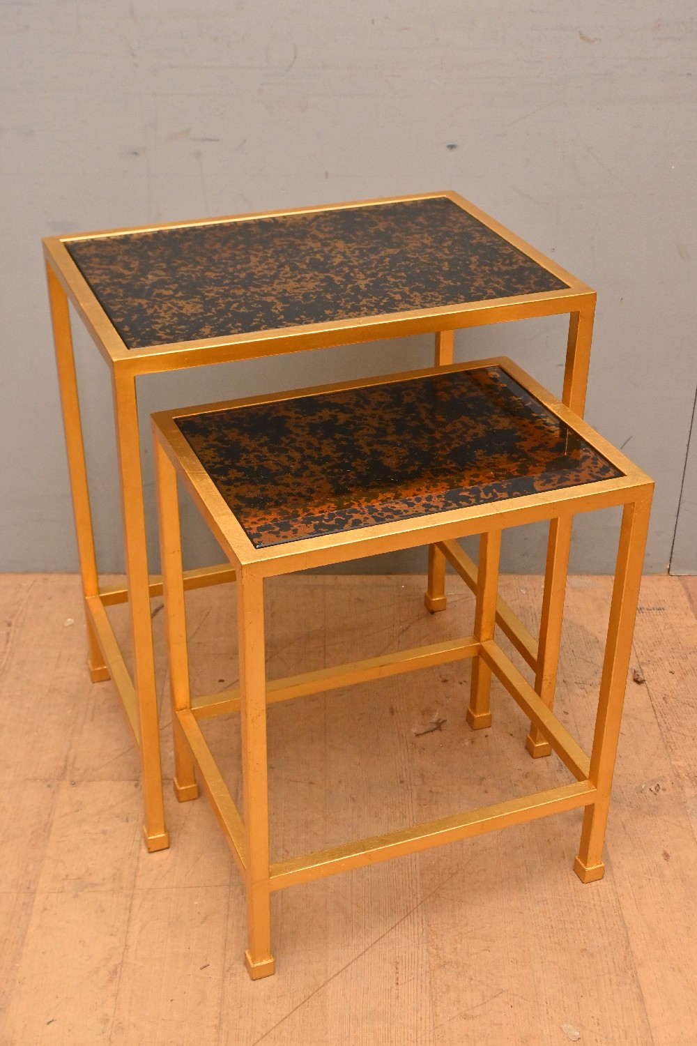 A NEST OF TWO GOLD LEAF AND MIRRORED SIDE TABLES (61H X 52W X 36D CM) (LEONARD JOEL DELIVERY SIZE: LARGE)