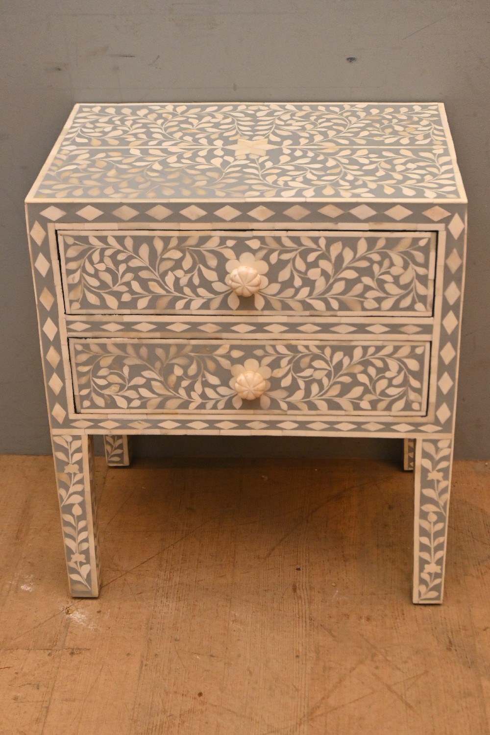 A TWO DRAWER BONE INLAY BEDSIDE (60H X 50W X 35D CM) (A/F) (LEONARD JOEL DELIVERY SIZE: LARGE)