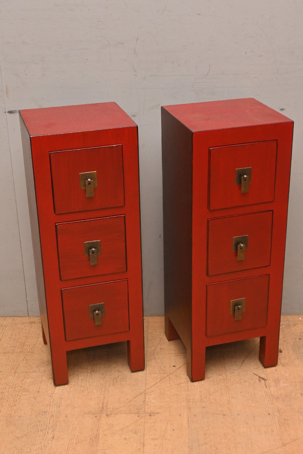 A PAIR OF CHINESE THREE DRAWER BEDSIDES (69H X 25W X 25D CM) (LEONARD JOEL DELIVERY SIZE: LARGE)