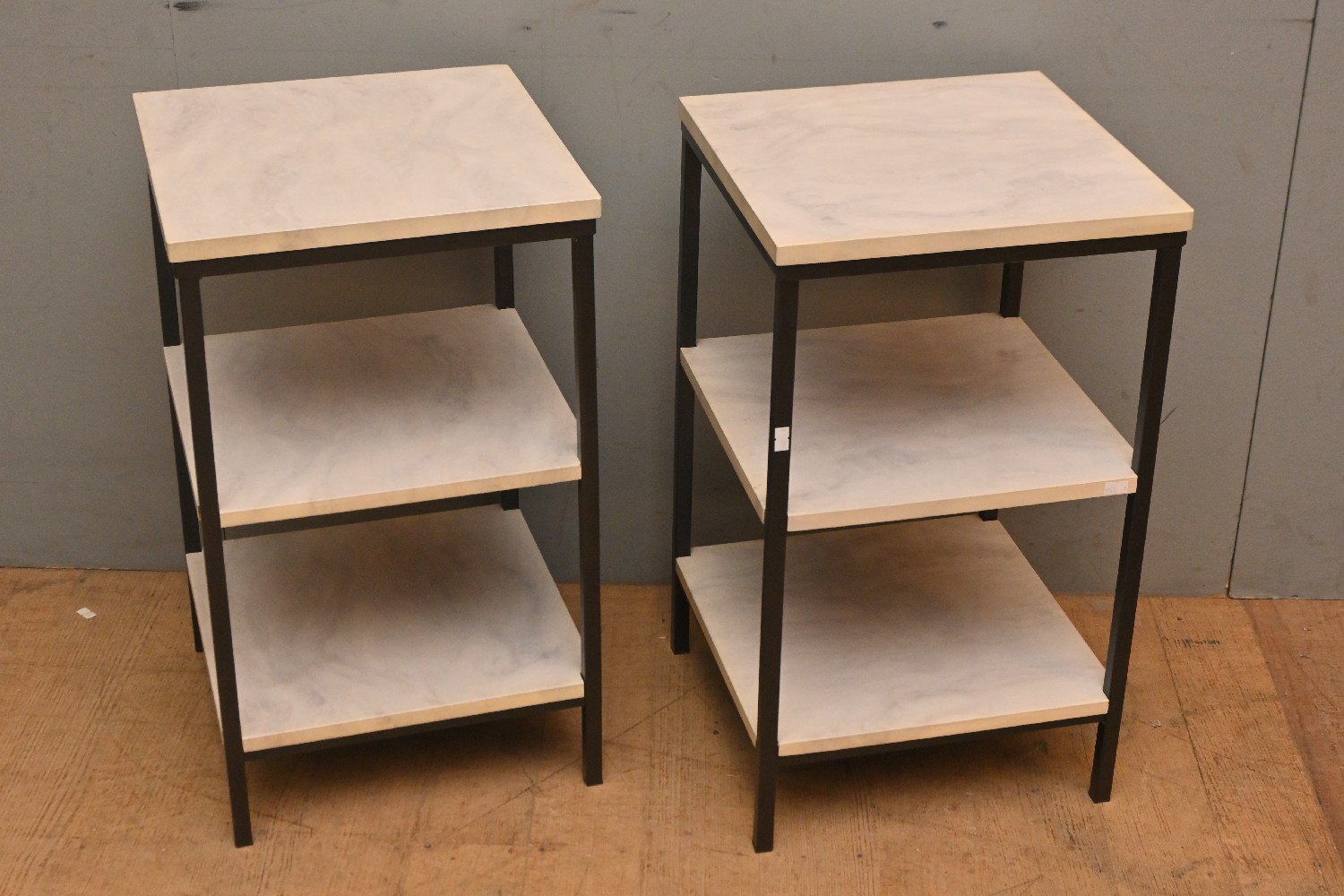 A PAIR OF MARBLE EFFECT THREE TIER SIDE TABLES (61H X 35W X 35D CM) (LEONARD JOEL DELIVERY SIZE: LARGE)