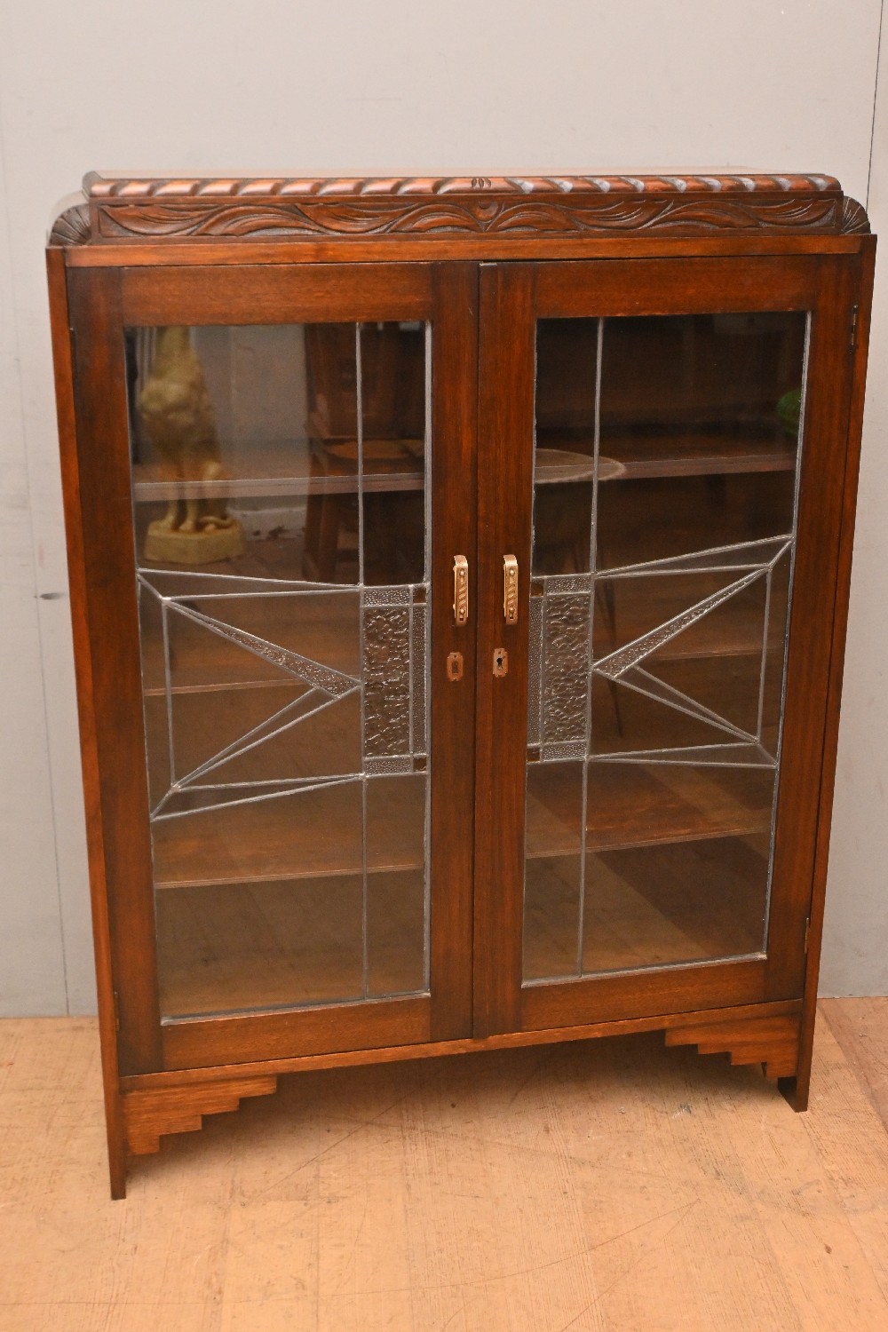 AN ART DECO OAK LOW BOOKCASE WITH LEADED GLAZING - KEY IN OFFICE (124H X 87W X 26D CM) (LEONARD JOEL DELIVERY SIZE: X-LARGE)