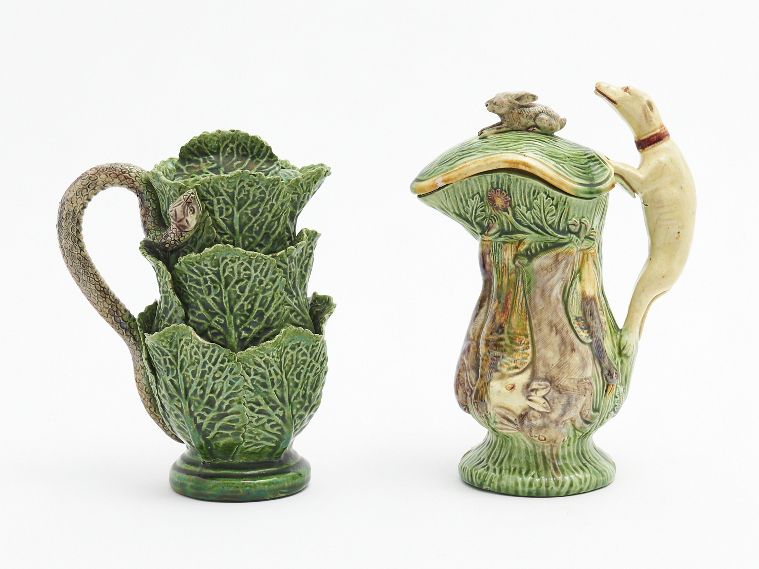 A PORTUGESE HOUND AND HARE MAJOLICA PITCHER AND COVER AND A STACKED CABBAGE MAJOLICA PITCHER AND COVER H.21CM (TALLEST) (A/F), LEONARD JOEL DELIVERY SIZE: MEDIUM
