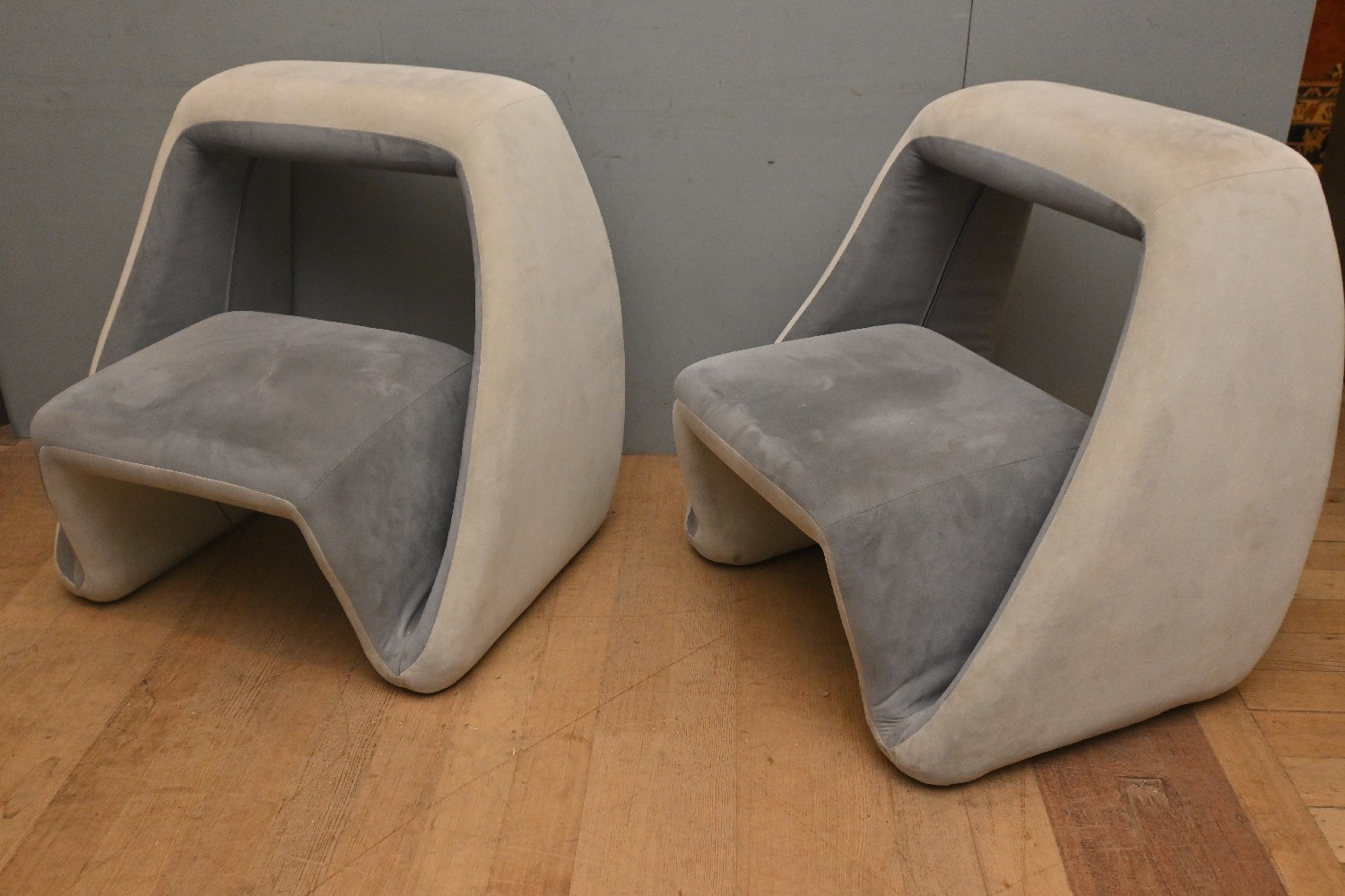 A PAIR OF ITALIAN DESIGN MODERNIST SUEDE CHAIRS (87H X 80W X 79D CM) (PLEASE NOTE THIS HEAVY ITEM MUST BE REMOVED BY CARRIERS AT THE CUSTOMER'S EXPENSE. LEONARD JOEL STAFF CANNOT ASSIST CARRYING THIS ITEM) (LARGE ITEM)
