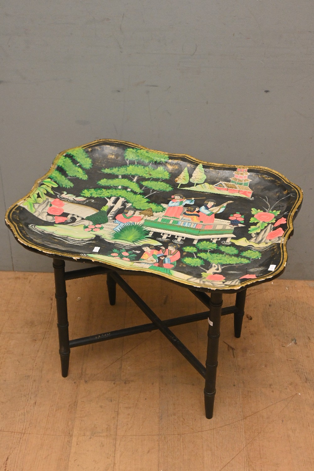 A PAINTED AND LACQUERED PAPIER MACHE TRAY ON LATER SIMULATED BAMBOO STAND (50H X 64W X 52D CM) (LEONARD JOEL DELIVERY SIZE: LARGE)