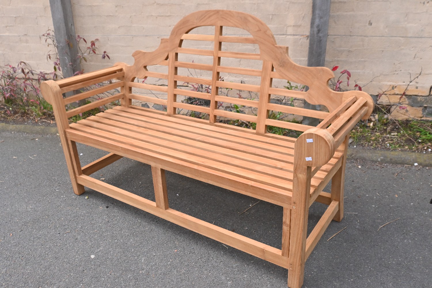 A TEAK GARDEN BENCH SEAT AFTER LUTYENS'S 'LITTLE THAKEHAM' DESIGN (105H X 167W X 58D CM) (PLEASE NOTE THIS HEAVY ITEM MUST BE REMOVED BY CARRIERS AT THE CUSTOMER'S EXPENSE. LEONARD JOEL STAFF CANNOT ASSIST CARRYING THIS ITEM) (LARGE ITEM)