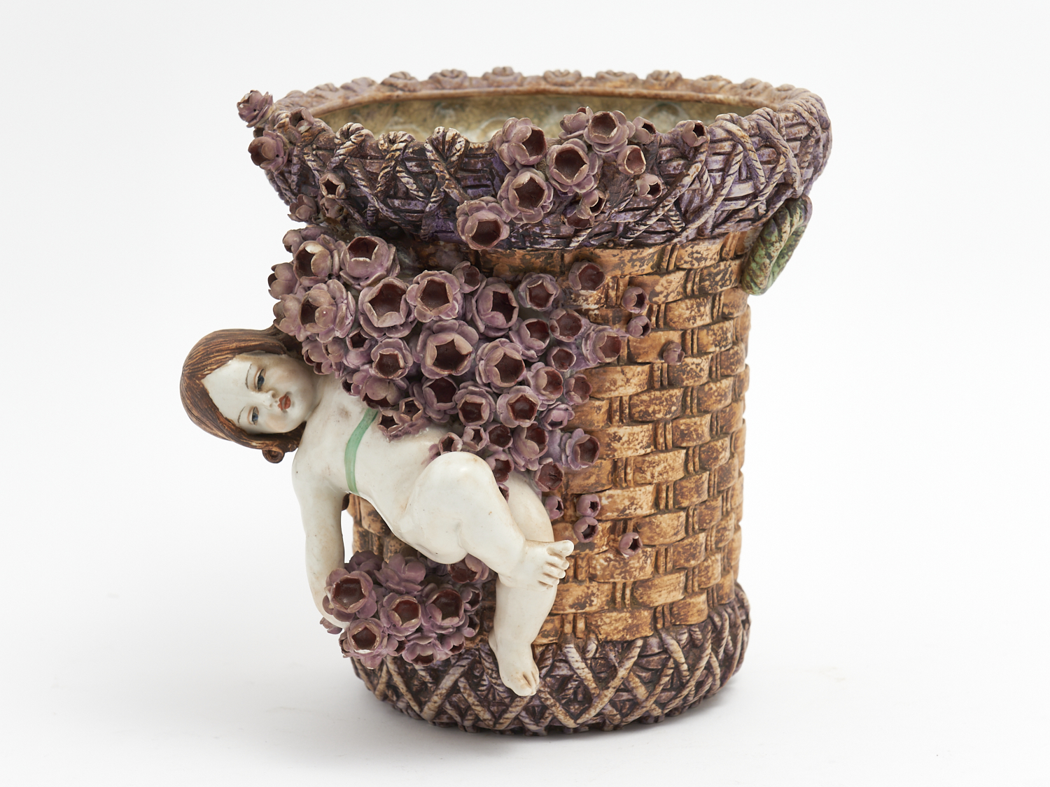 A CERAMIC JARDINIÈRE MODELLED AS A BASKET DECORATED WITH ENCRUSTED FLOWERS AND THE FIGURE OF A CHERUBIC GIRL H.23CM, LEONARD JOEL DELIVERY SIZE: SMALL