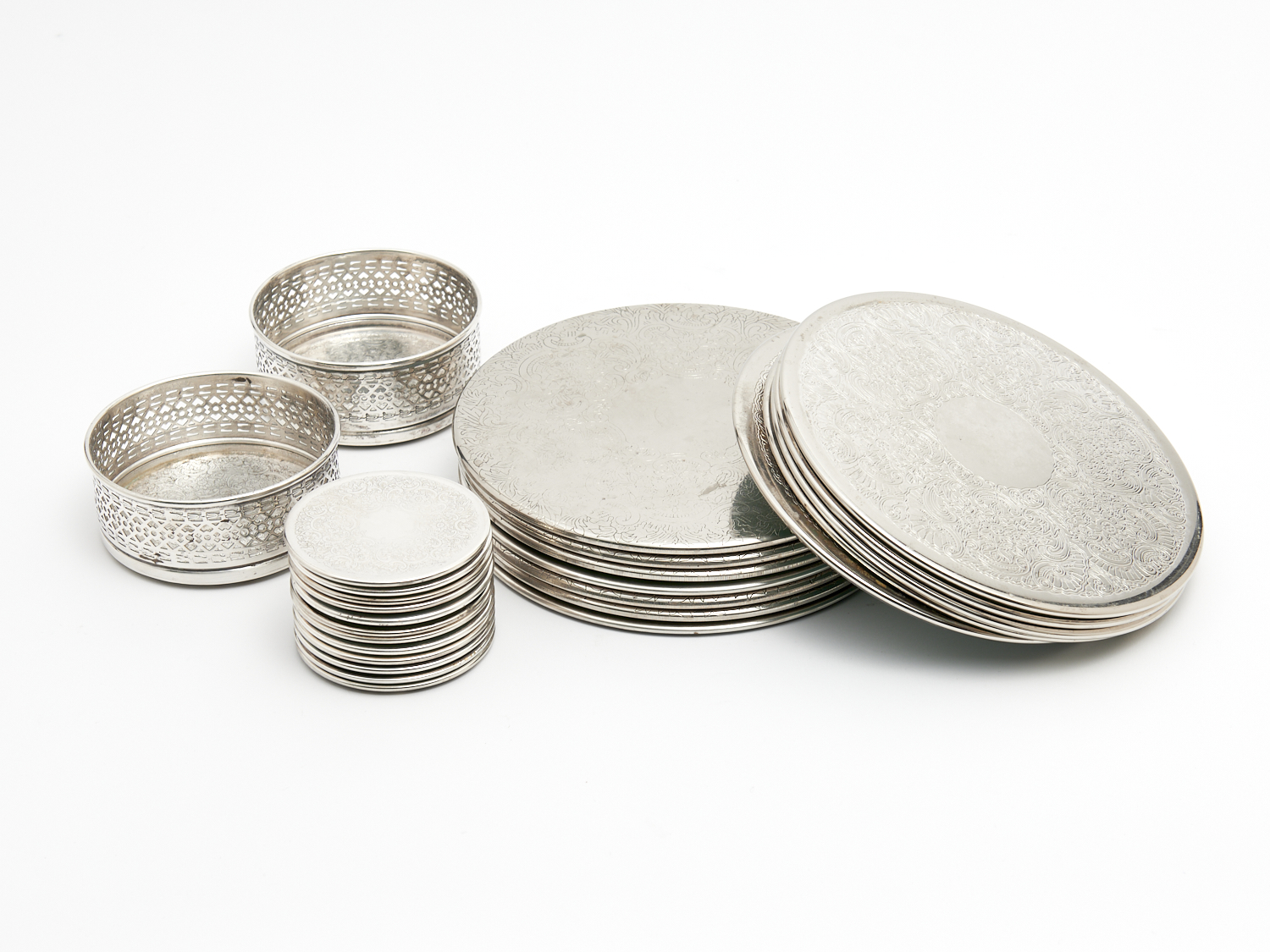TWELVE STRACHAN PLATE COASTERS, TWELVE WINE GLASS COASTERS AND TWO WINE BOTTLE COASTERS DIA.20.5CM (LARGEST), LEONARD JOEL DELIVERY SIZE: MEDIUM
