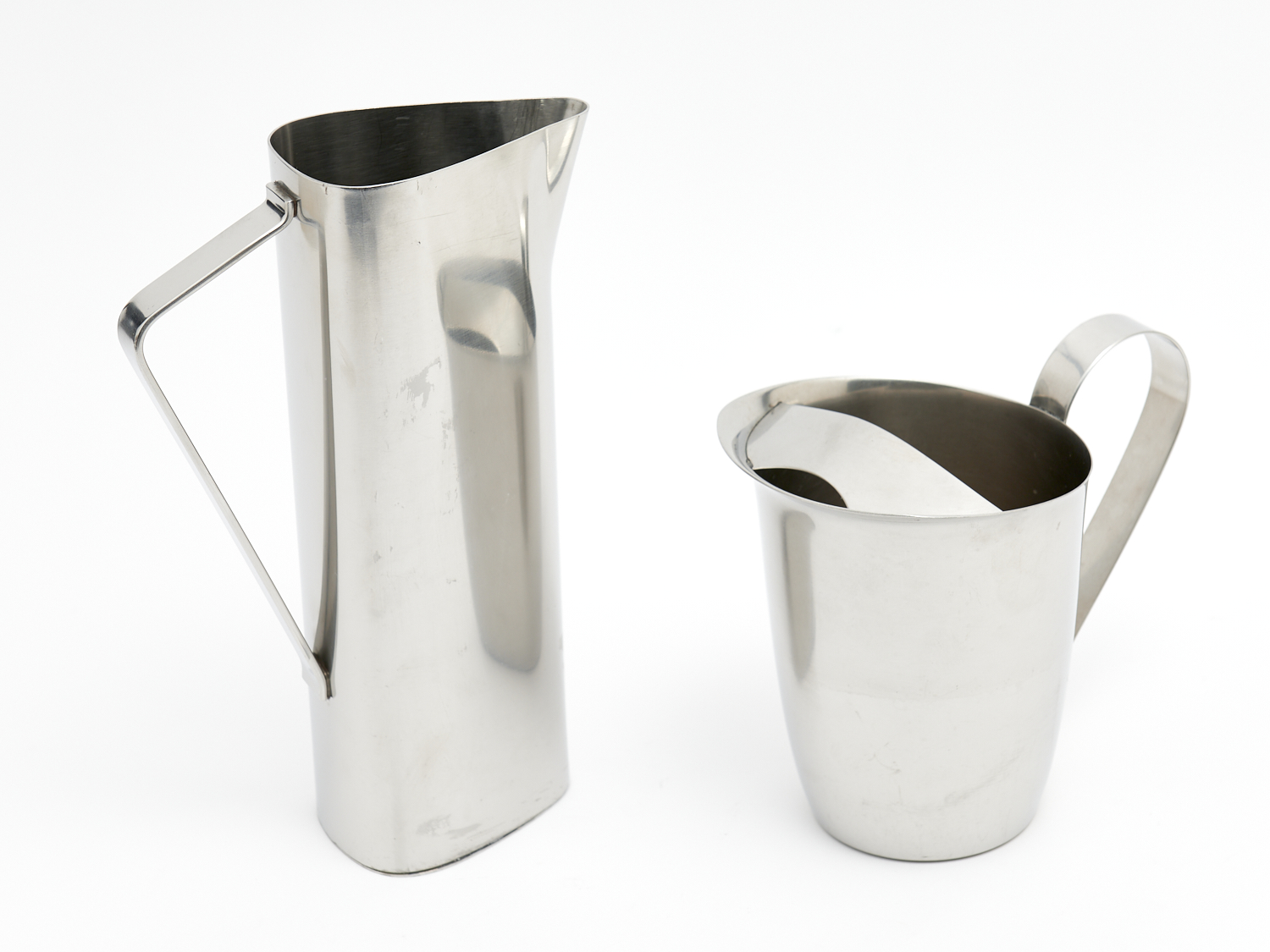 A TALL DANISH STAINLESS STEEL JUG BY LONE SACHS FOR LUNDTOFTE AND A VINTAGE DANISH SELANDIA JUG H.25CM, LEONARD JOEL DELIVERY SIZE: SMALL