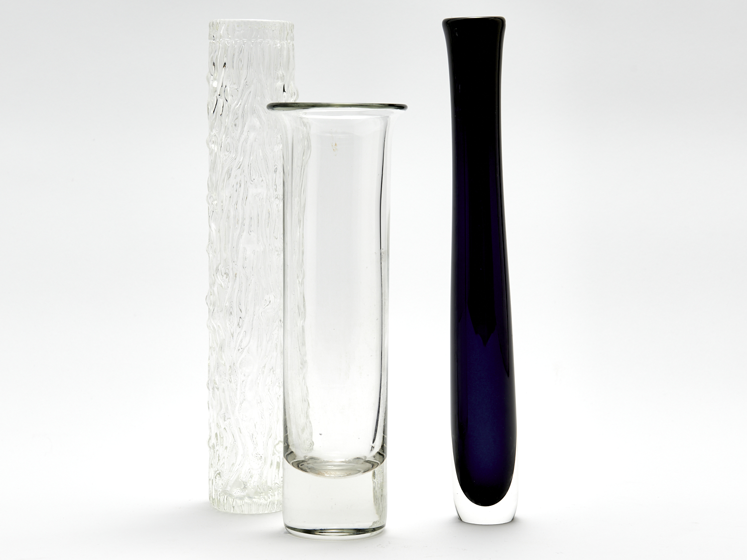 THREE TALL MID-CENTURY GLASS VASES H.31CM, LEONARD JOEL DELIVERY SIZE: SMALL