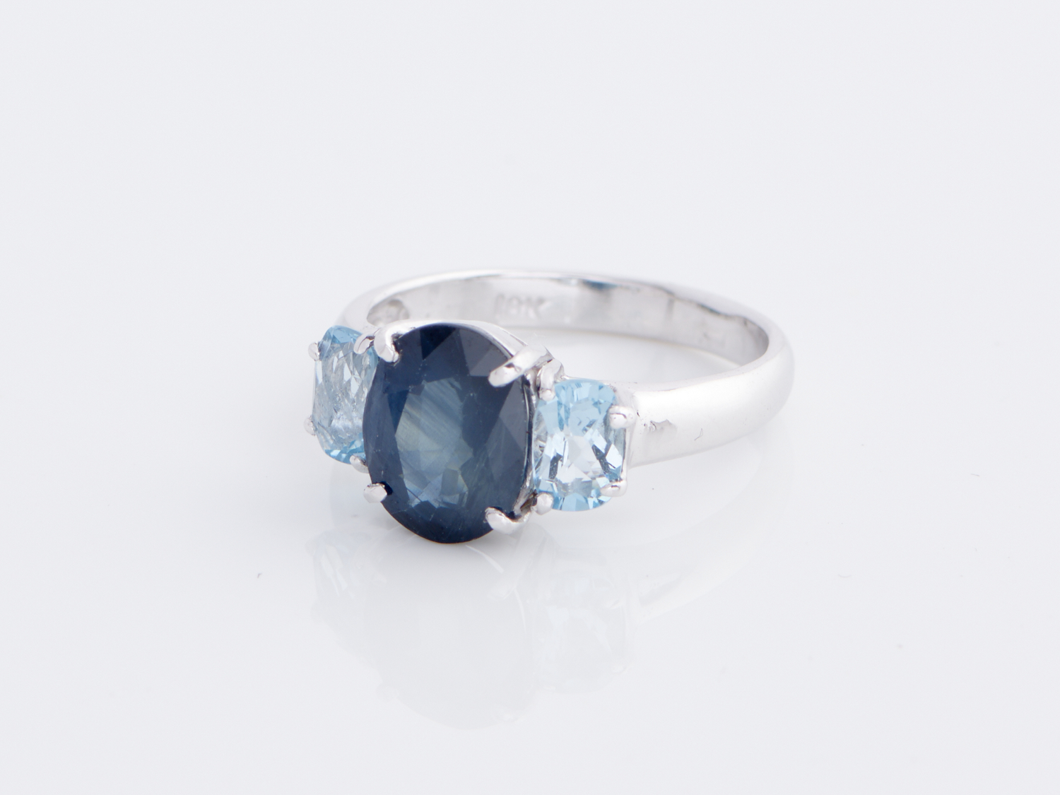 A SAPPHIRE AND AQUAMARINE RING IN 18CT WHITE GOLD, THE SAPPHIRE TOTALLING 2.91CTS, THE AQUAMARINE TOTALLING 1.20CTS, SIZE O, ACCOMPANIED BY A CERTIFICATE,
