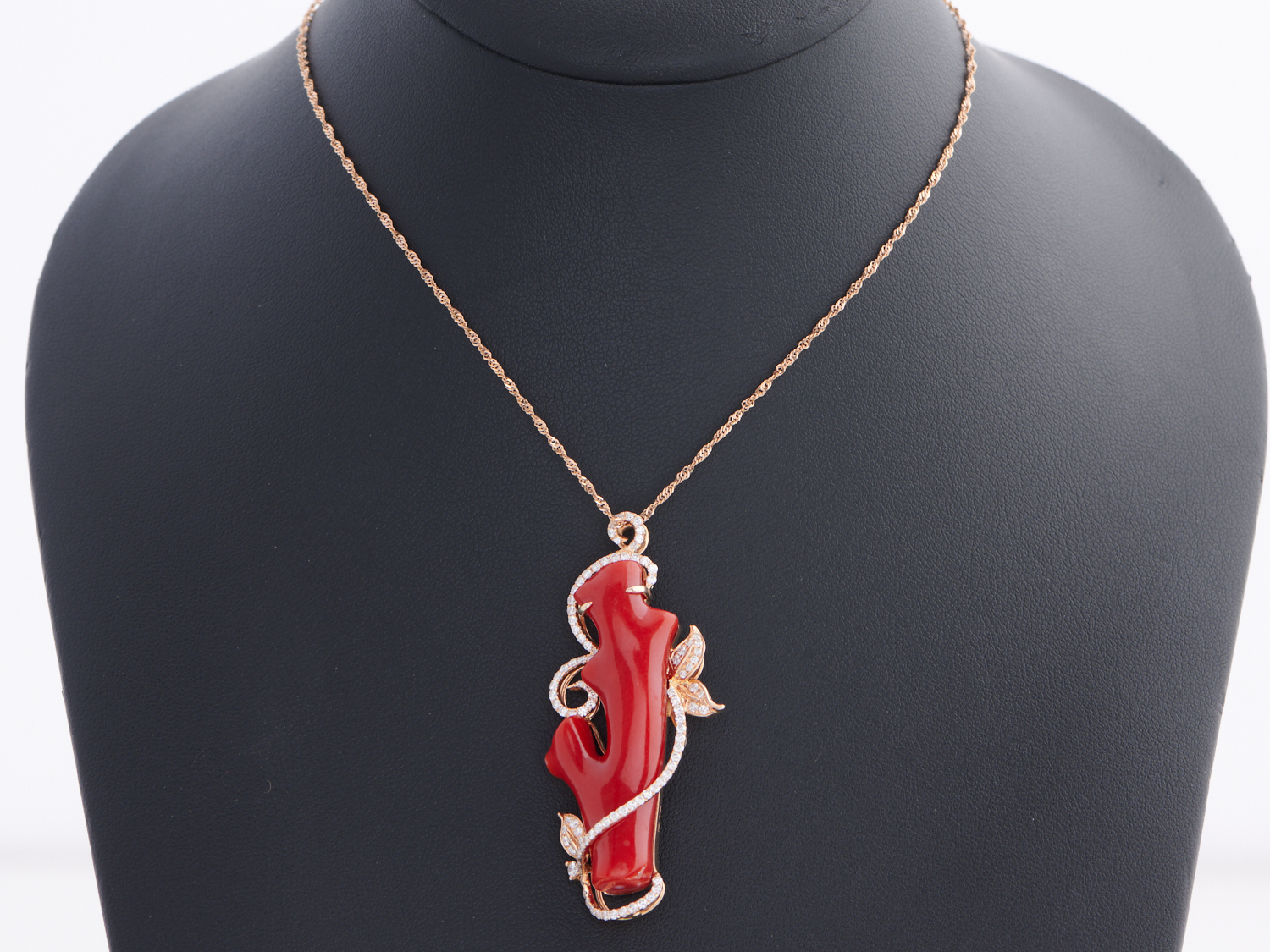 A CORAL AND DIAMOND PENDANT IN 18CT ROSE GOLD TO A FINE ITALIAN CHAIN IN 18CT ROSE GOLD, THE PENDANT MEASURING 55 X 22MM, WEIGHT 13.7GMS, CHAIN LENGTH 460MM