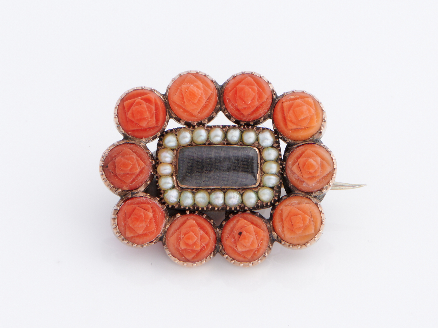 A GEORGIAN CORAL AND SEED PEARL MOURNING BROOCH IN LOW CARAT GOLD, 25 X 20MM