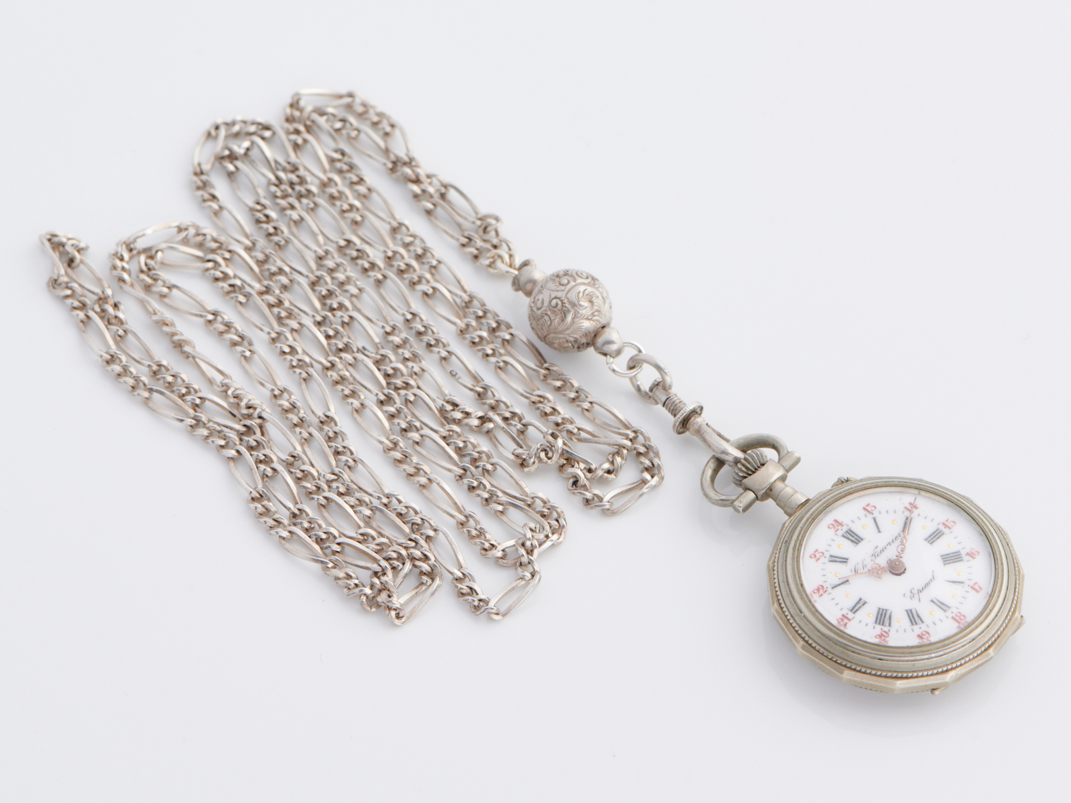 A LONG FANCY FRENCH GUARD CHAIN IN SILVER, TO A VINTAGE ENGRAVED FOB WATCH IN SILVER