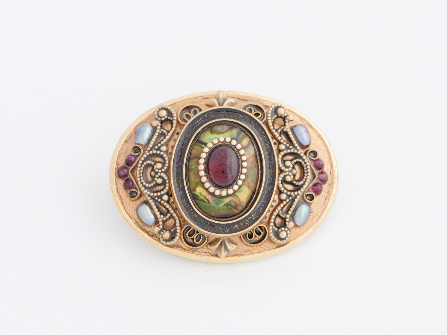 MICHAEL GOLAN, A VINTAGE GEM SET PENDANT BROOCH IN GOLD PLATE, 35 X 45MM