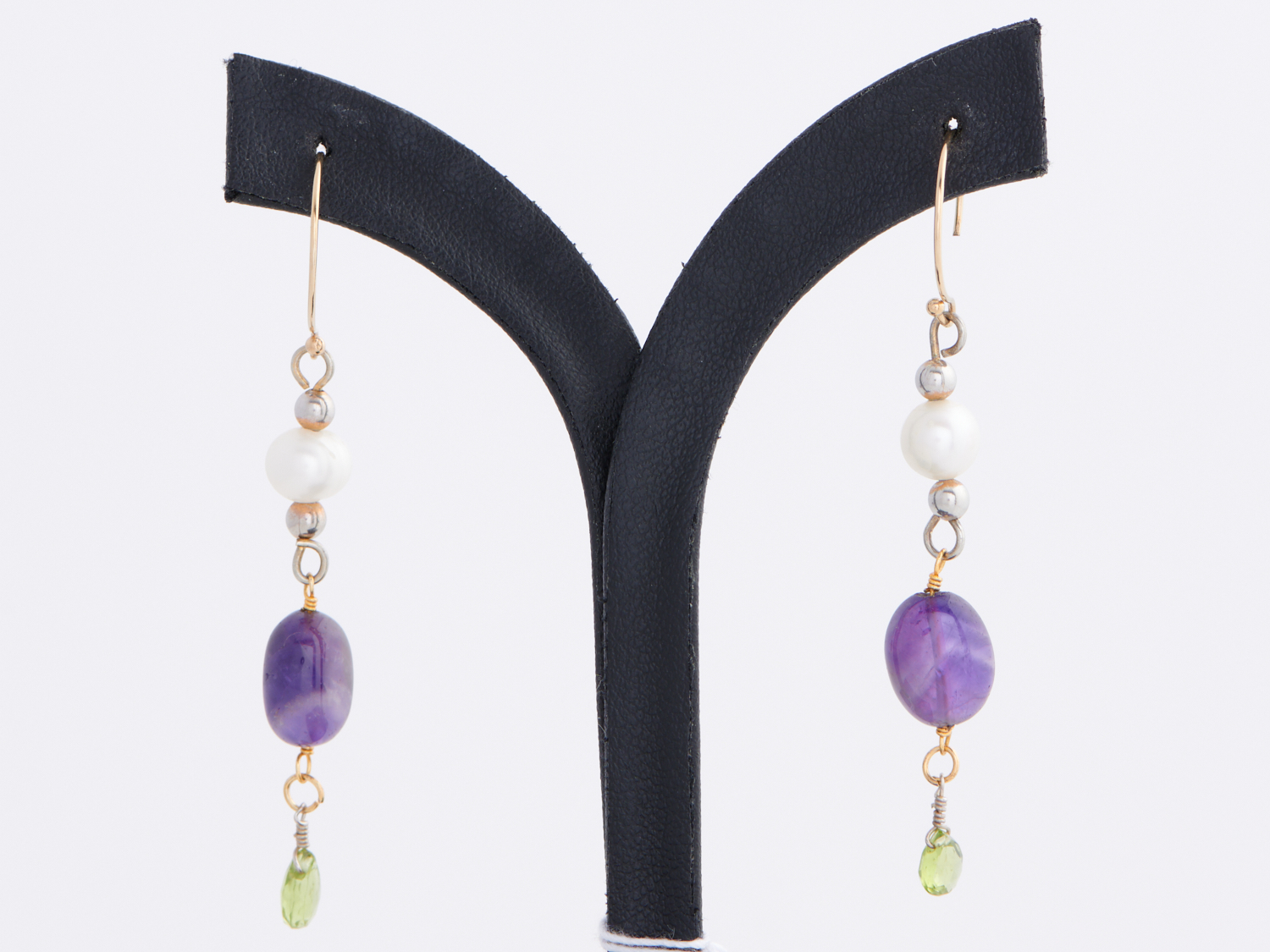A PAIR OF VINTAGE PEARL, AMETHYST AND PERIDOT EARRINGS, TO HOOK FITTINGS, APPOXIMATELY 60MM