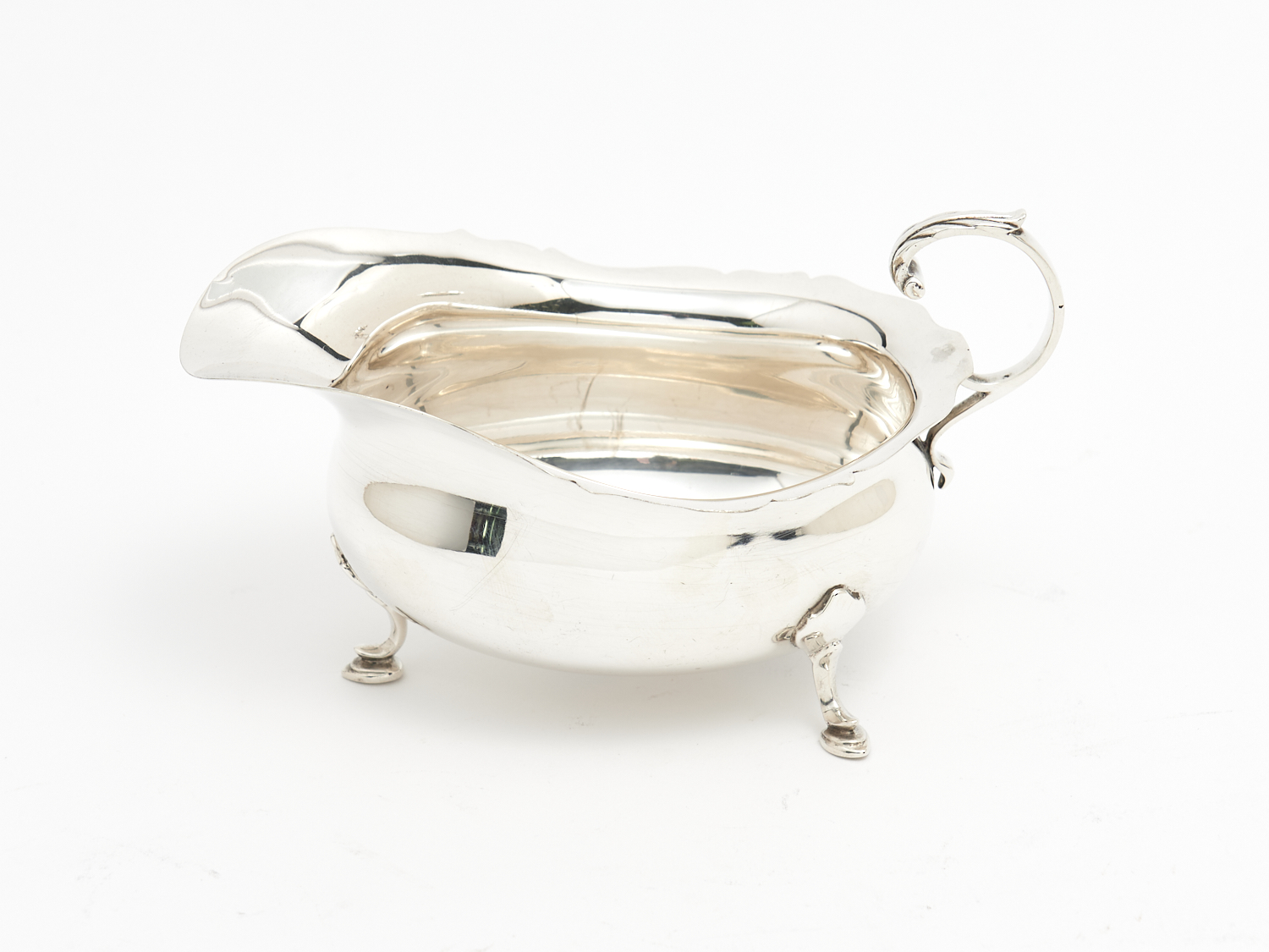 A 1900S ENGLISH HALLMARKED STERLING SILVER GRAVY/CREAM BOAT L.15CM 124G, LEONARD JOEL LOCAL DELIVERY SIZE: SMALL