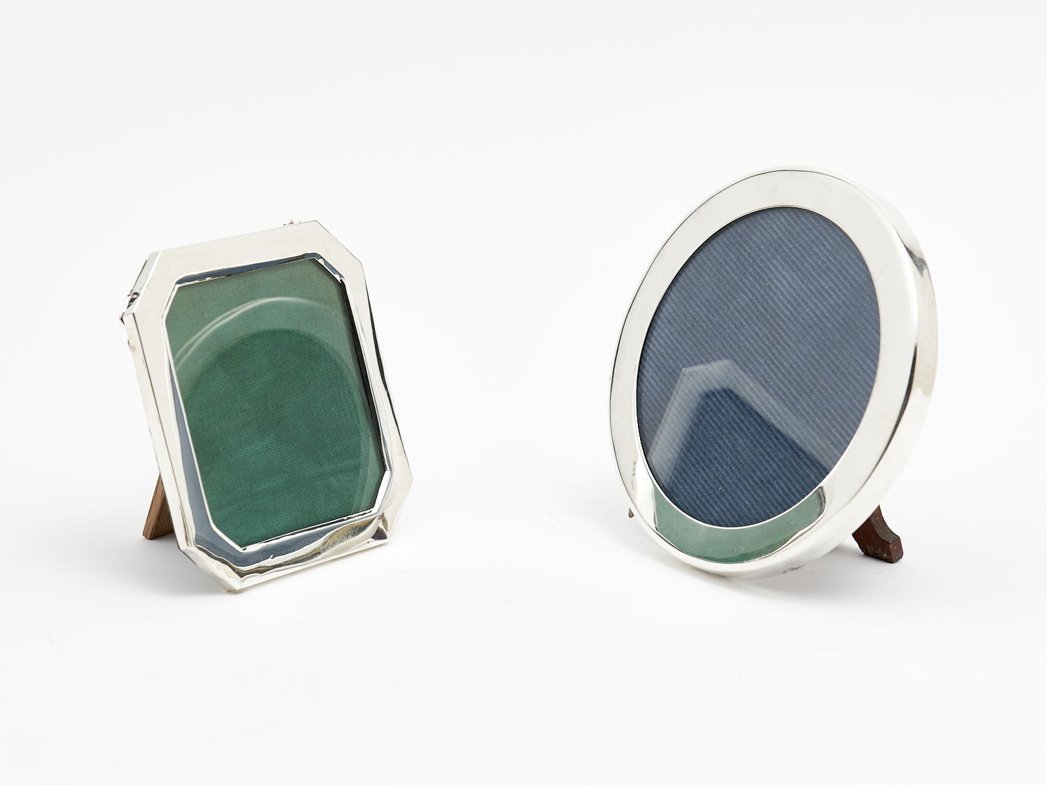 TWO ENGLISH EARLY 20TH CENTURY HALLMARKED STERLING SILVER PICTURE FRAMES INCLUDING CIRCULAR AND SQUARE FORM H.12.5CM (TALLEST), LEONARD JOEL LOCAL DELIVERY SIZE: SMALL