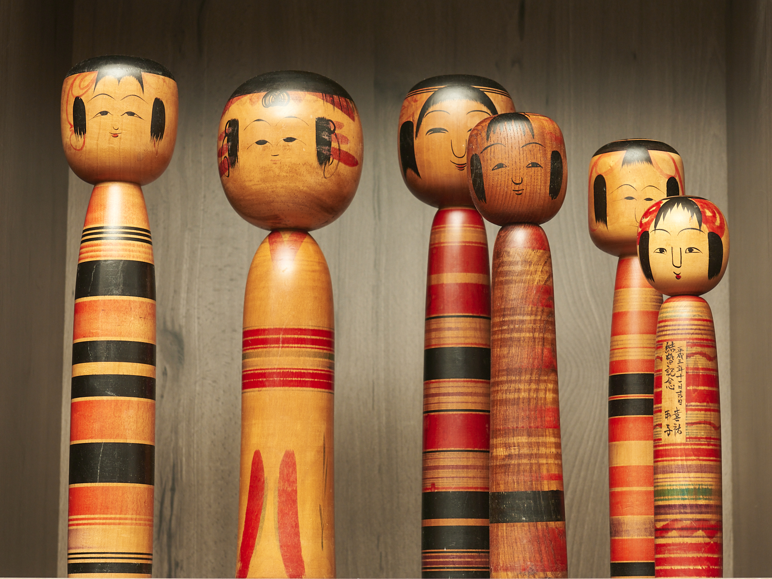 A GROUP OF SIX HAND PAINTED WOODEN KOKESHI DOLLS, STRIPED DESIGN H.36CM (TALLEST), LEONARD JOEL DELIVERY SIZE: MEDIUM