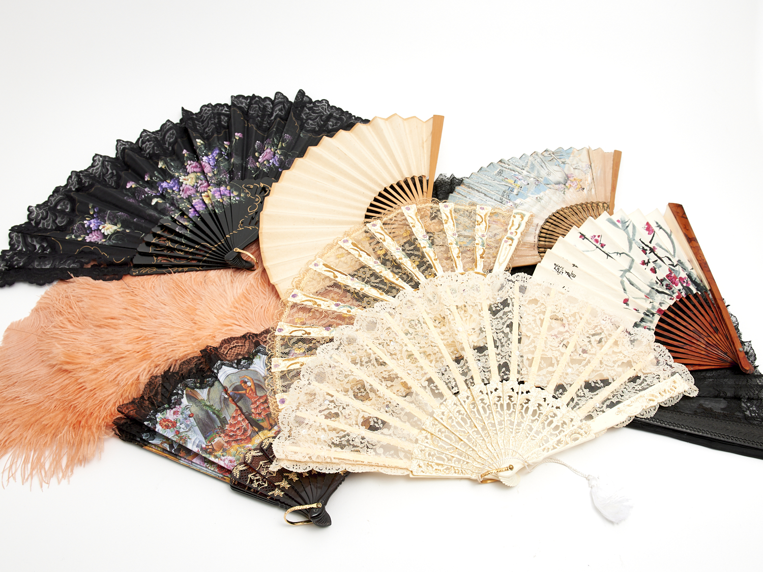 A GROUP OF FEATHER CARVED WOODEN AND SILK FANS (C.1900 - 1940) H.36M (TALLEST), LEONARD JOEL DELIVERY SIZE: SMALL