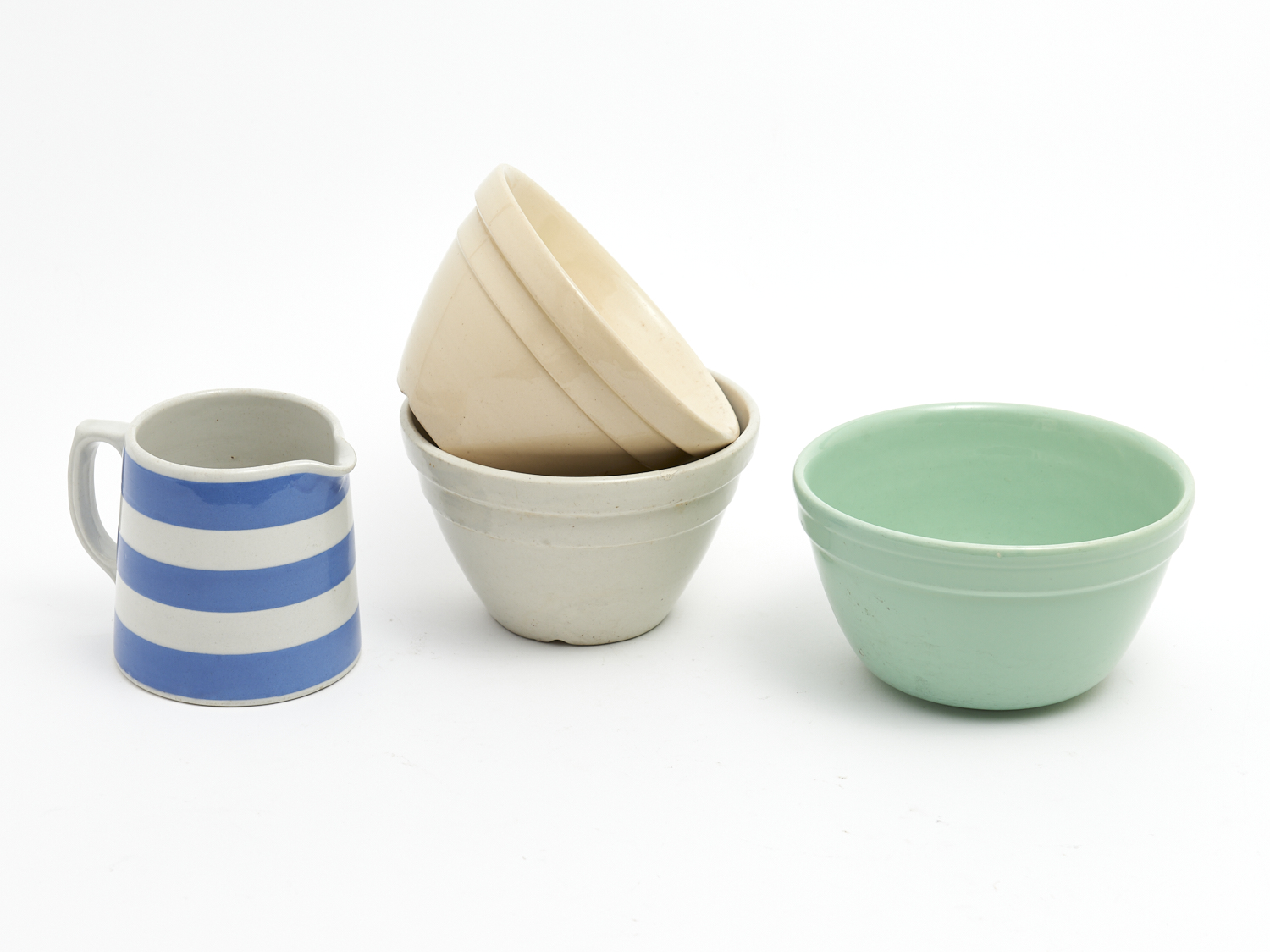 A GROUP OF AUSTRALIAN POTTERY HOFFMAN MIXING BOWLS AND A STRIPED BLUE AND WHITE JUG DIA.17.5CM (WIDEST), LEONARD JOEL DELIVERY SIZE: SMALL