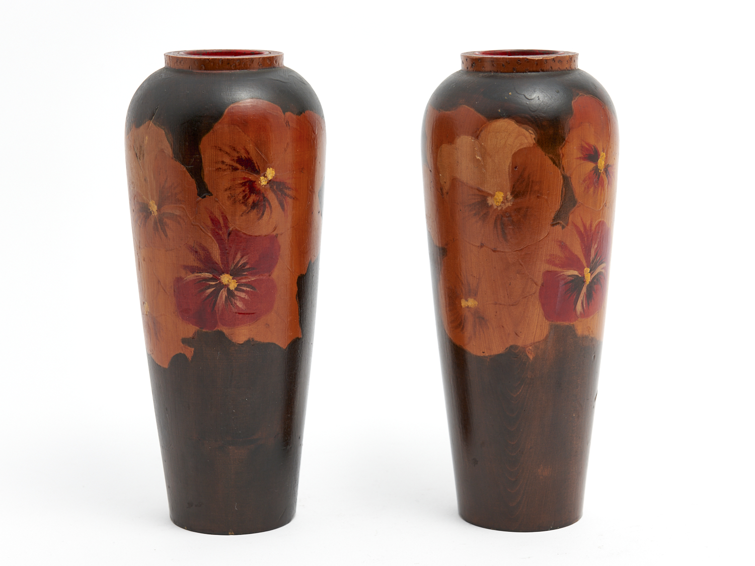 A PAIR OF EARLY 20TH CENTURY AUSTRALIAN HUON PINE PANSY POKERWORK VASES H.23CM, LEONARD JOEL DELIVERY SIZE: SMALL
